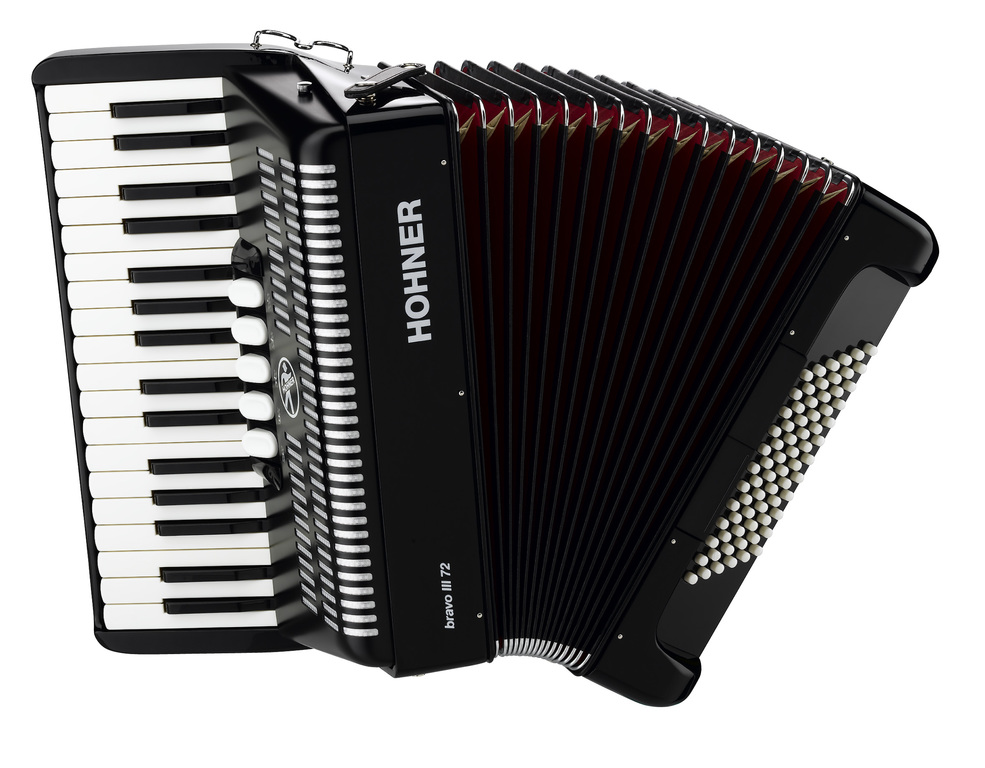 A1662 BRAVO III 72 Black Аккордеон Hohner. 3-х голосный, правая рука - 34 клавиши, 5 регистров, левая рука - 72 баса, цвет черный, вес 7,4 кг. 39,4 x 18,5см