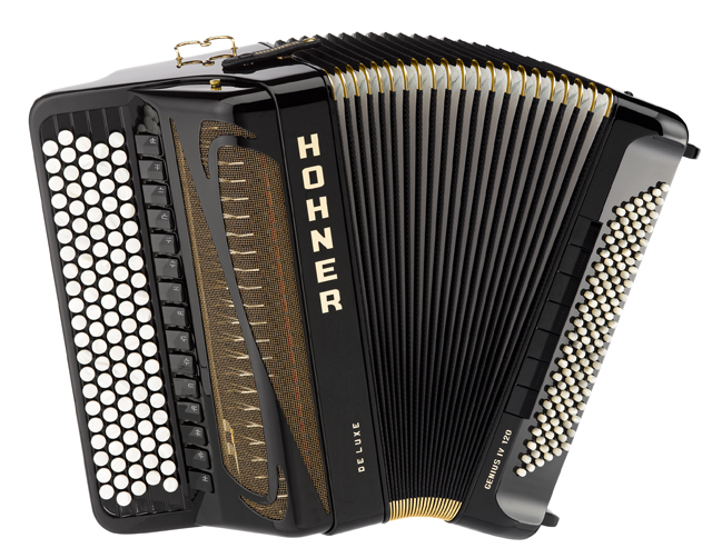 A3688 GENIUS IV 120 De Luxe B-System Баян (Аккордеон кнопочный) Hohner. 4-х голосный, правая рука - 105 кнопок (5 рядов), 15 регистров, Октавный диапазон: 64 (E – G), Язычков, звучащих в кассотто 2 ( 16?+ 8?), левая рука (готовый аккомпанемент) - 120 басов, 7 регистров, 5 голосов, цвет черный, в комплекте футляр и ремни, 46,5x23,5см, 13,1 кг. Hohner