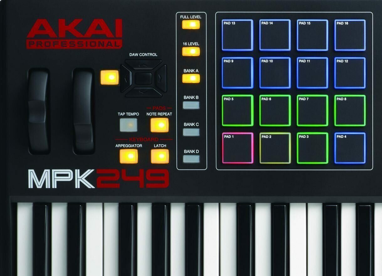 49-ти клавишная MIDI клавиатура MPK249 помещена в низкопрофильный корпус, который имеет 16 триггерных пад клавиши с RGB led подсветкой (позаимствованные у контроллеров серии MPC), яркий LCD дисплей, 8 поворотных регуляторов и 8 фейдеров и все самые необходимые клавиши для транспорта и навигации.