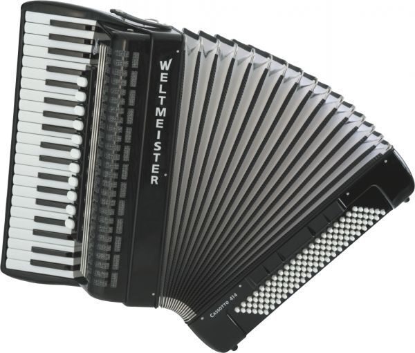Weltmeister Cassotto 414 – инструмент-наследник знаменитого аккордеона Weltmeister Supita, который много лет считается самым надежными инструментом для профессиональных музыкантов. Технические характеристики: 11 регистров справа. 5 регистров – слева. Диапазон звучания мелодии от “Фа” большой октавы до “Ля” 4-й октавы. Диапазон звучания аккомпанемента - от “Ми” большой октавы до “Ре-диез” 2-й октавы. С ремнями, в футляре. Цвета производителя: черный, красный, зеленый, голубой, белый, серый, коричневое дерево.