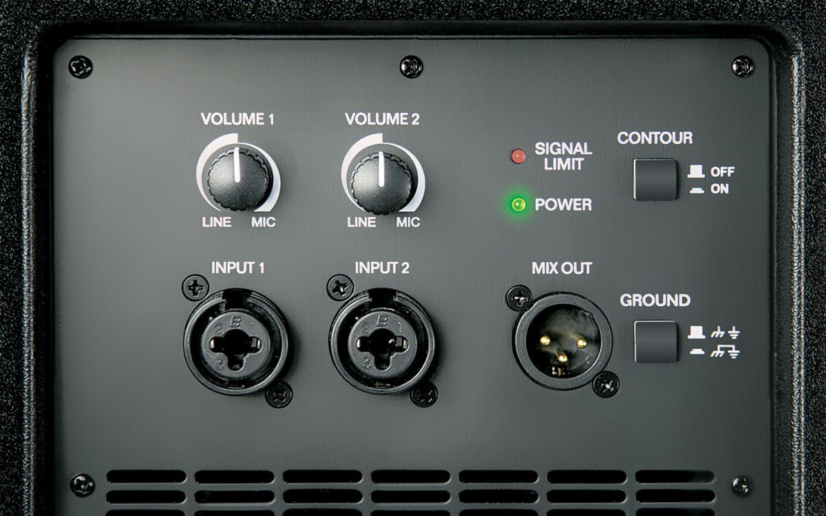 Вся настройка и управление акустикой осуществляется при помощи ручек регулировки уровня входной чувствительности (Vol. 1 \ 2), работающей для линейного входа (Line) или же входа для микрофонов (Mic). Настройка каналов Volume 1 \ 2 имеют диапазон от + 50 dB, с максимальными характеристиками входного сигнала в +23 dBu. Дополнительные переключатели Ground, Contour и переключатель Power имеют стандартные режимы работы - оn\off. Система оснащена светодиодной индикацией функций Signal limit и Power. Дополнительно есть встроенная система охлаждения, имеющая независимый контур электроники с кулером охлаждения. Коммутационные разъемы системы имеют (Input 1\2) комбинированные разъёмы XLR и стандартный Jack (1\4). Разьем Mix Out имеет линейные характеристики, сквозной, симметричный канал с выходом на XLR разъёме.