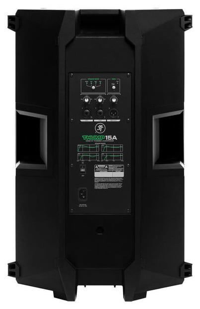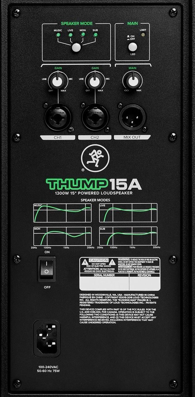 На задней панели находится трехполосный эквалайзер и ручка громкости, а внутри кабинета - активная электроника Mackie, работающая на оптимизацию звучания АС. Для коммутации доступен 1 комбинированный вход - микрофон/линия. Корпус кабинета сделан из ударопрочного полипропилена. Есть гнездо для установки на стойку. Размеры кабинета акустической системы составляют (Ш/В/Г) 689 х 427 х 401 мм, вес - 16,3 кг.