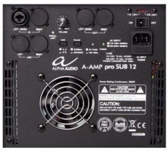 Alpha Audio A-Amp pro12 Sub 12 — Активный сабвуфер в корпусе из черного мультиплекса. Максимальная мощность 600 Вт. Частотный диапазон 47 Гц-125 кГц (-10 дБ). Активный кроссовер с фильтром высоких частот 80 Гц (аналоговый процессор).