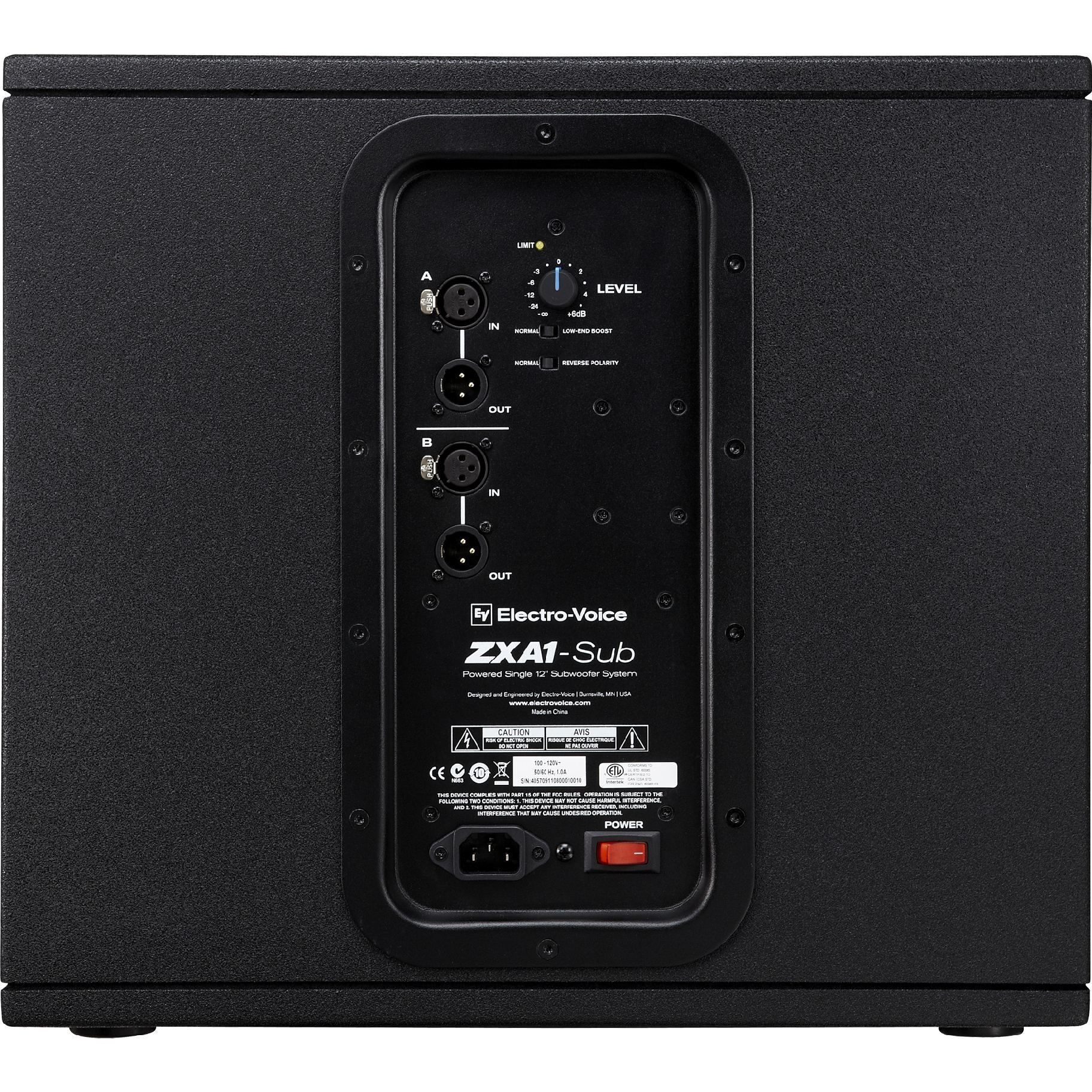 Усилитель оснащён кроссовером с большой крутизной нарастания и спада характеристики, а также цепью защиты от перегрузки динамика. Лёгкий корпус изготовлен из 15-мм листов 9-слойной фанеры, скреплённых изнутри, а снаружи покрыт структурной краской. Крепкие, удобные для переноса ручки, расположенные с двух сторон, и "стакан" для стойки в верхней части АС делают Electro Voice ZXA1-Sub идеальной для портативных приложений. Оснащен переключателем для активации фильтра, расширяющего НЧ диапазон; переключателем для смены полярности; LED-индикаторами питания и перегрузки.
