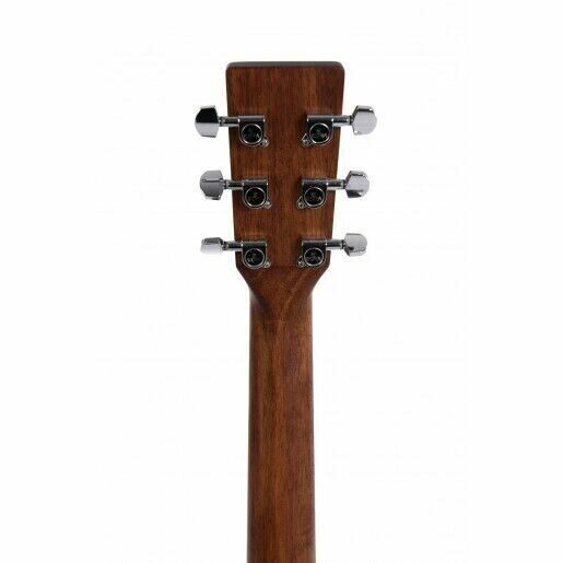 Эта гитара цвета санберст с ультратонким глянцевым УФ-покрытием имеет гриф из махагони с накладкой из композитного материала микарта, который отличается невероятной прочностью, стабильным поведением в различных условиях, устойчивостью к попаданию воды и повышенной влажности воздуха. Верхняя дека выполнена из массива ситхинской ели - достаточно плотной, но при этом эластичной древесины, предоставляющей чистый акустический звук с хорошим динамическим диапазоном и сустейном. Нижняя дека и обечайки изготовлены из махагони - красного дерева, придающего звучанию теплый тон. Эстетическая привлекательность инструмента подчеркивается белой окантовкой, оригинальным дизайном маркеров ладов и жемчугом Abalone в виде рисунка на голове грифа.
