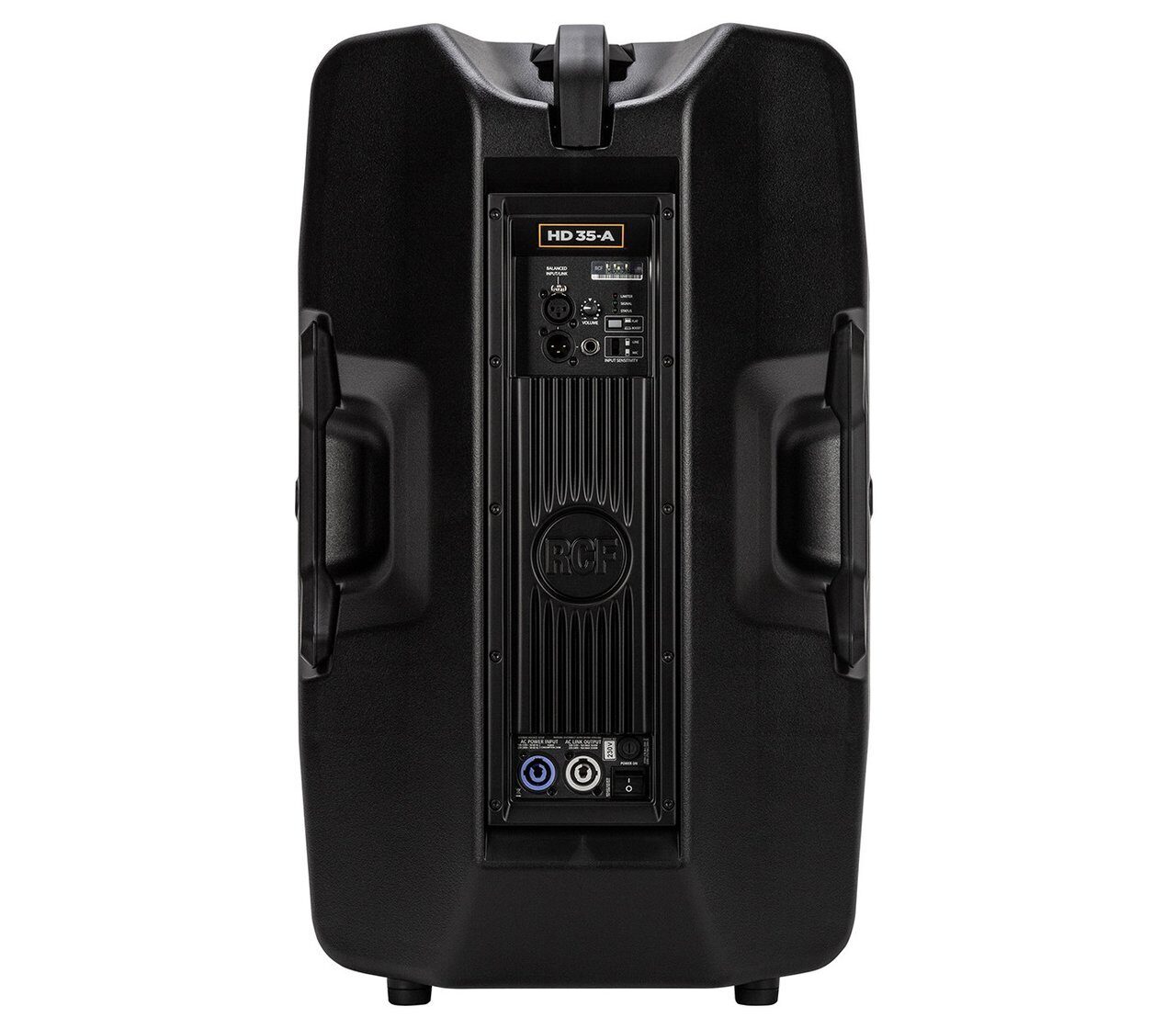 RCF HD 35-A активная двухполосная АС. Она выделяется простотой оформления и высокой звуковой производительностью. Использование компрессионного ВЧ-драйвера 1.4" с мощной звуковой катушкой предоставляет исключительную звуковую проекцию и четкость воспроизведения вокала. Низкочастотный преобразователь 15-дюймов предлагает чрезвычайно линейный отклик и глубокое, точное низкочастотное управление. Усилитель выдает 1400 Вт и управляется при помощи DSP процессора, который предоставляет пользователю такие полезные функции как кроссовер, эквалайзер, FiRPHASE фильтры, мягкое ограничение и защиту динамиков. Прочный корпус громкоговорителя изготовлен из литого композитного материала, который с высокой эффективностью устраняет нежелательные вибрации при использовании высокой громкости. Для простоты транспортировки предусмотрена одна верхняя и две боковые прорезиненные ручки.
