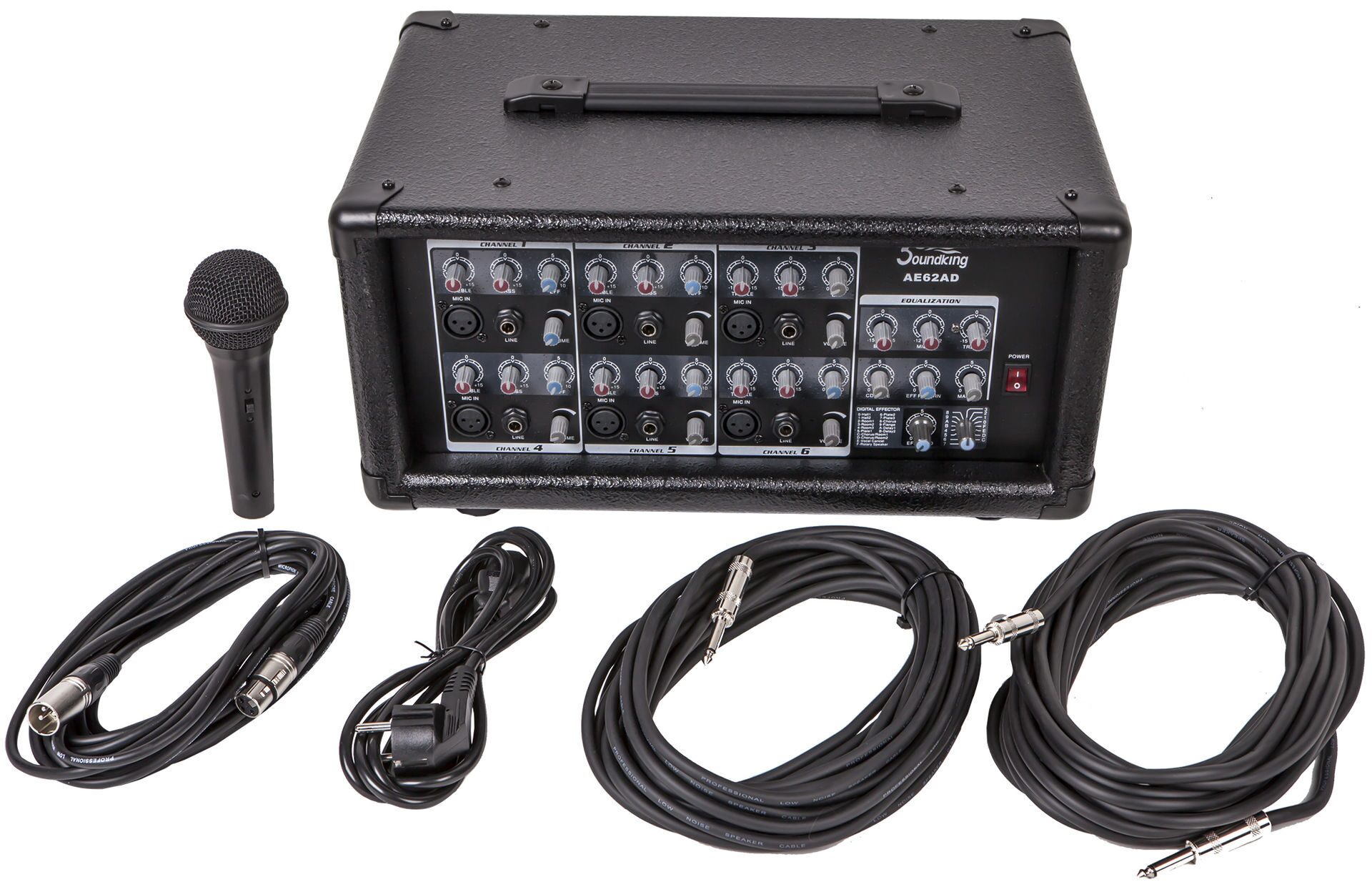 Мобильный звуковой комплект общей мощностью 500 Вт состоящий из микшерного пульта со встроенным усилителем и акустических систем с 15" динамикам и пьезо твитером. В комплект поставки так же входят две акустические стойки под АС, динамический микрофон с кабелем 5 метров и два акустических кабеля Jack-Jack длиной по 10 метров каждый.