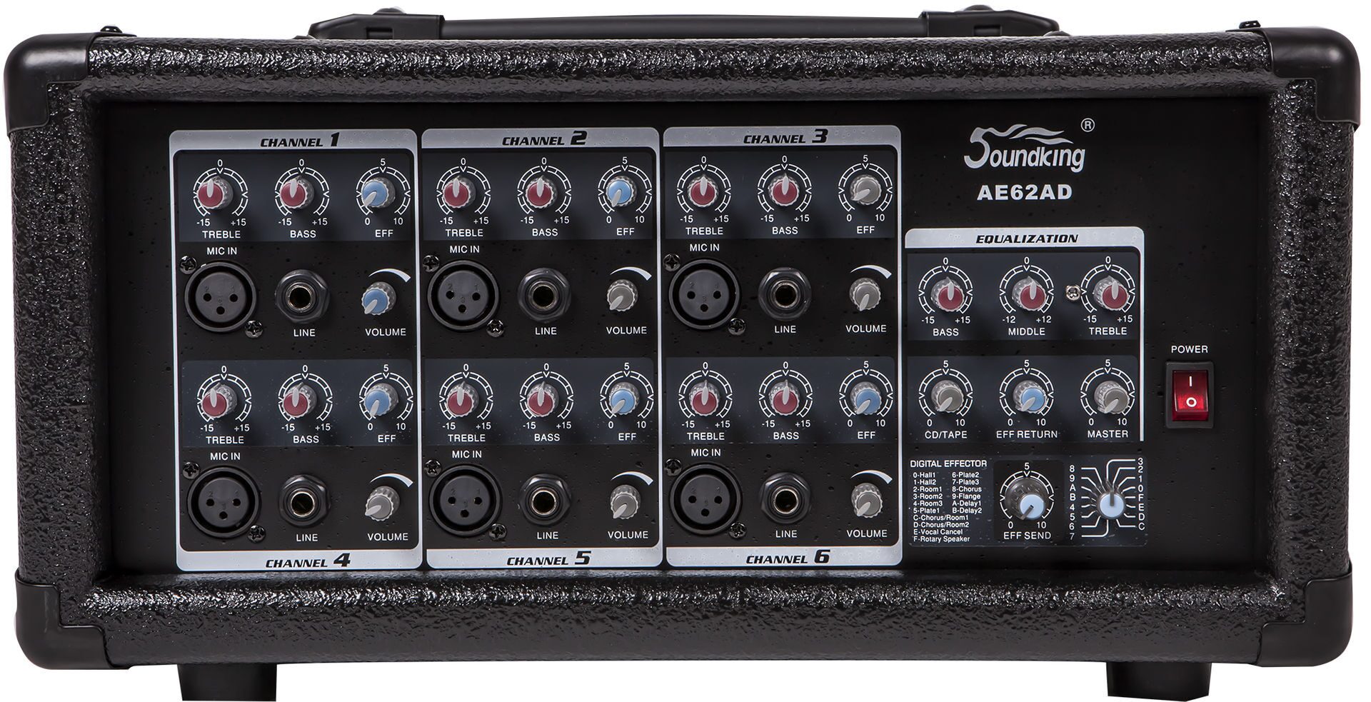 Микшерный пульт имеет 6 входных каналов (XLR/1/4" Jack) и встроенный процессор эффектов с 16-ю пресетами. Так же на каждом канале имеется двухполосная эквализация, посыл на обработку и ручка регулировки канала.