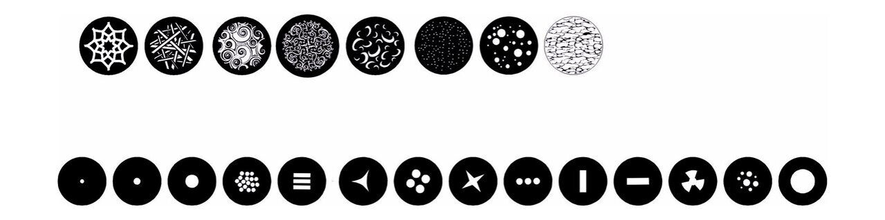 | 1 колесо гобо: | 14 статичных гобо рисунков + открытый, вращение колеса гобо по и против часовой стрелке, эффект тряски |
