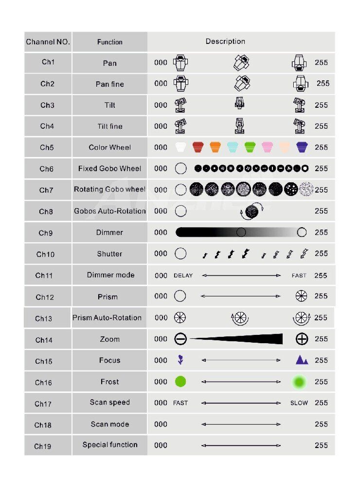 | Количество каналов DMX: | 19 каналов (один режим) |