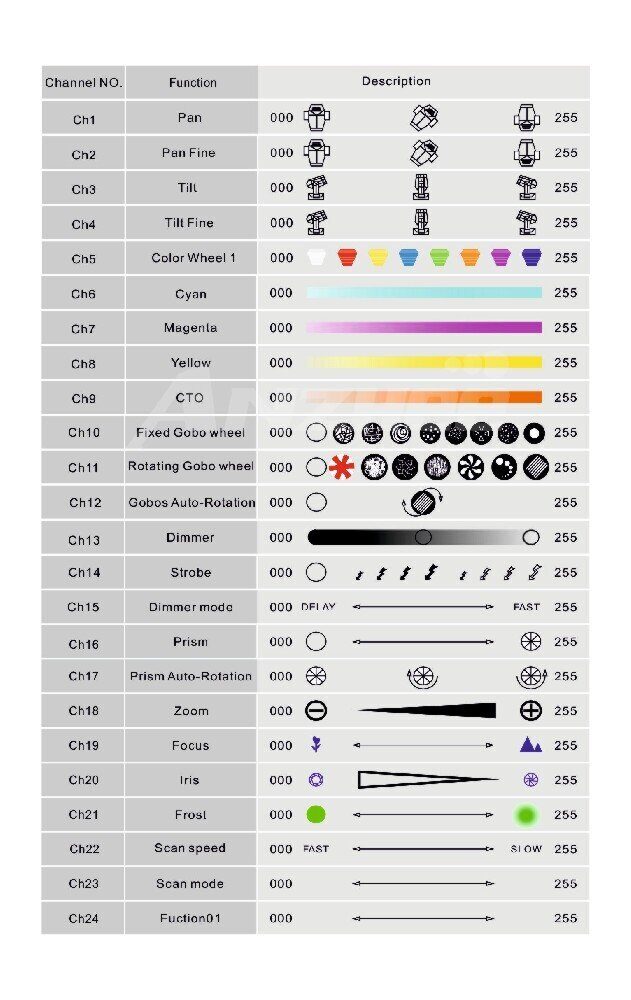 | 2 колесо гобо: | 7 вращающихся гобо рисунков + открытый, вращение колеса по и против часовой стрелке |