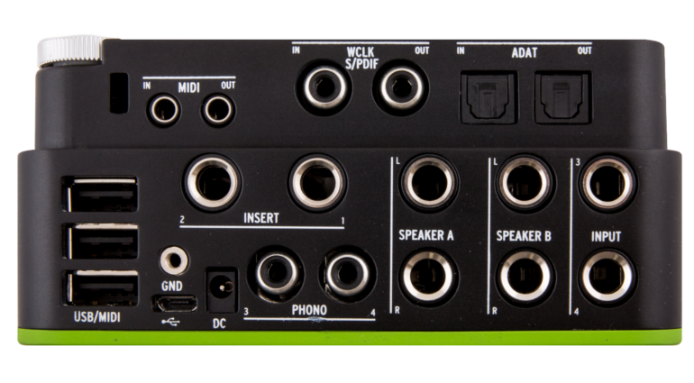 • 4 аналоговых входа: пара микрофонных/линейных/инструментальных на комбинированных разъёмах XLR/TRS плюс два входа Phono/Line;