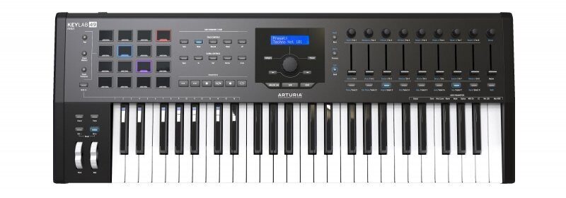 Флагманский MIDI-контроллер Arturia KeyLab MkII — это квантовый скачок с точки зрения управления, качества и экспрессии. Его отличительные особенности: 49 -клавишная клавиатура с откликом, алюминиевый корпус, продвинутый конфигурируемый интерфейс, 16 пэдов с RGB-подсветкой, 9 крупных фейдеров, 9 поворотных ручек (энкодеров), 5 входов управления экспрессией, 4 CV-выхода, интеллектуальные переключатели категорий и, конечно, MIDI- и USB-порты. В состав комплекта включено впечатляющее программное обеспечение: цифровое пианино Arturia’s complete Piano V, Analog Lab 3, and Ableton Live Lite.