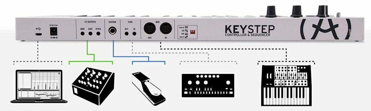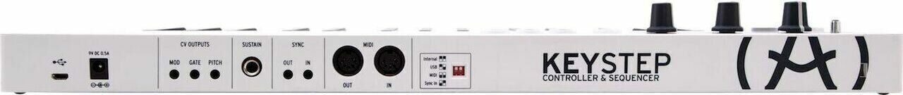 В ARTURIA KEYSTEP интегрированы разъем для подключения педали сустейна, вход синхронизации для ввода и вывода информации при приеме и посыле синхронизирующих сигналов и MIDI вход для использования внешней клавиатуры или использования KEYSTEP в качестве конвертера MIDI в CV.