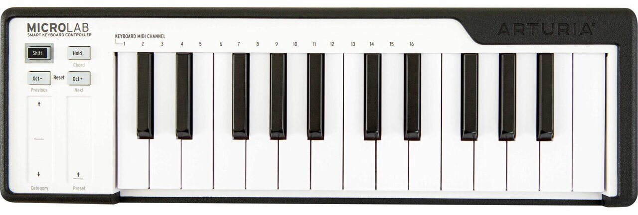 Всего 4 кнопки и 2 сенсорные полосы обеспечивают отличную управляемость MicroLab. Кнопка «Hold» обеспечивает функцию педали сустейна, а при нажатии её вместе с клавишей «Shift» вы получаете доступ к режиму «Chord», позволяя вам программировать аккорды и воспроизводить их одним нажатием. MicroLab также оснащен емкостными сенсорными полосами модуляции и высоты тона, которые позволяют пролистывать и выбирать пресеты в одно касание.