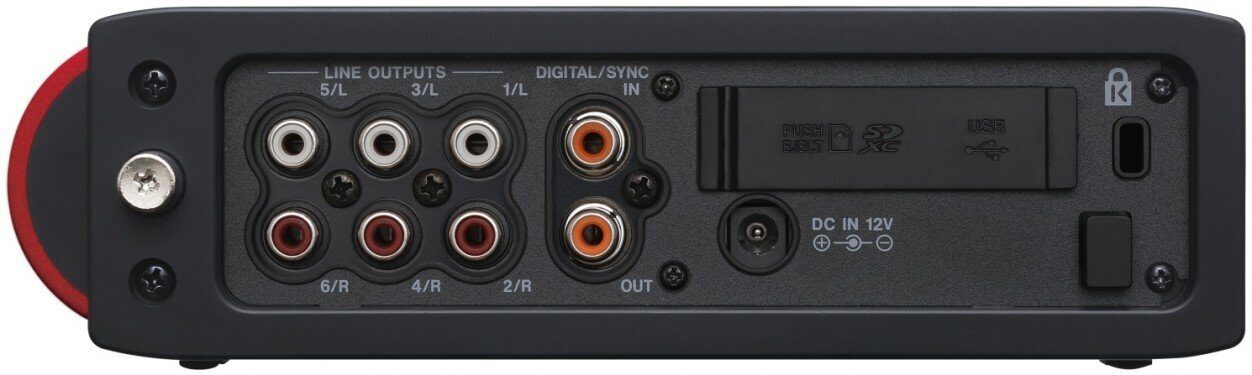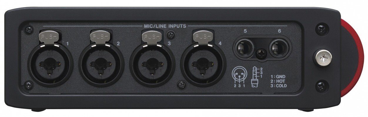 - Шесть балансных микрофонных/линейных входов (четыре на разъёмах XLR + TRS и два на TRS) плюс двухканальный цифровой вход позволяют записывать одновременно до 8 дорожек в качестве 24 бит / 96 кГц.