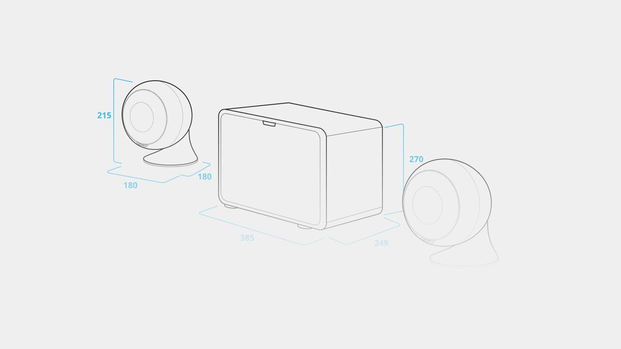 EvoSound Sphere 2.1 Pearl состоит из трех элементов: двух сферических сателлитов SE 05 SP и активного сабвуфера SE 08 SWA.