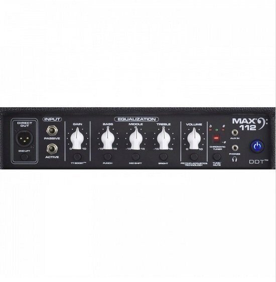 Басовый комбоусилитель Peavey MAX® 112 оборудован системой защитной компрессии DDT™, 12-дюймовым вуфером, трёхполосным эквалайзером с функциями Punch, Mid-shift и Bright, психоакустической обработкой низких частот и запатентованной системой усиления TransTube®. MAX® 112 способен выдавать до 200 Вт и создавать удивительный мощный бас при довольно компактных размерах. Также есть встроенный хроматический тюнер, XLR с отрывом земли, 3.5-мм джек для наушников и вход AUX.