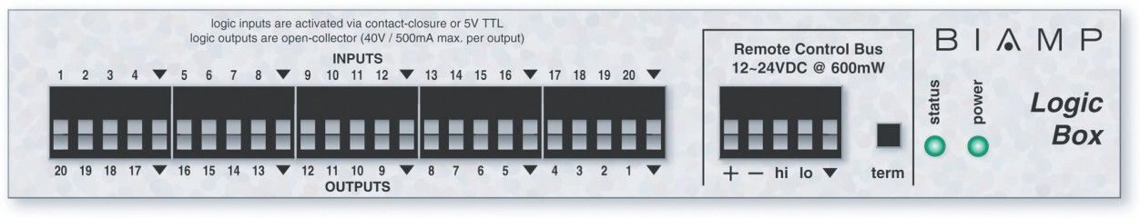 Biamp Logic Box позволяет с помощью внешних контактов (кнопок, реле и т.п.) управлять событиями внутри системы или по событиям внутри системы управлять внешними устройствами. Каждый вывод на Logic Box может быть настроен либо как логический вход, либо как логический выход.