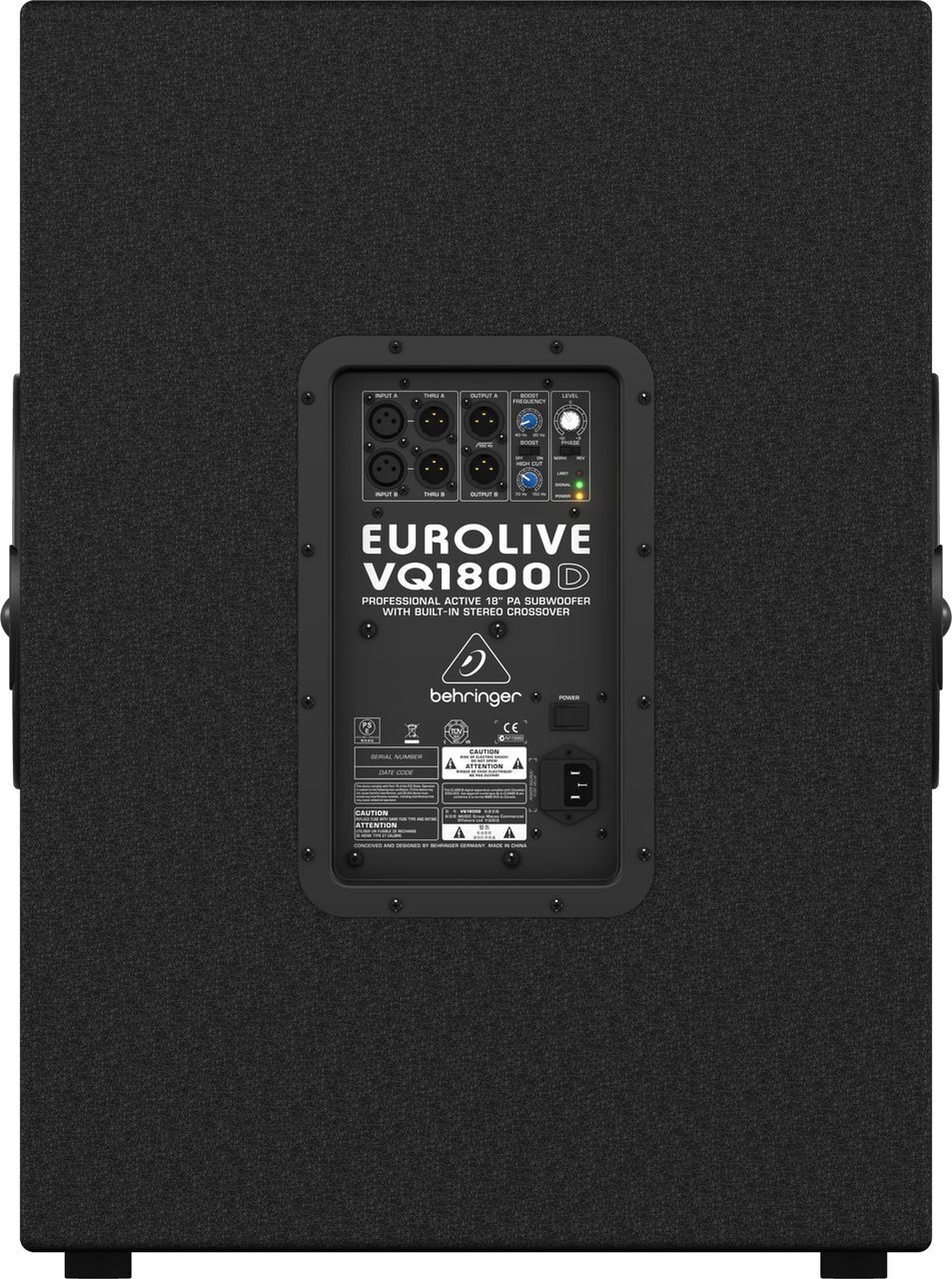 VQ1800D характеризуется сбалансированными XLR входами и выходами, а также сбалансированными джеками XLR Thru для подключения дополнительных систем. Ручка повышения частоты (Boost Frequency) предназначена для регулировки частоты между 40 Гц и 90 Гц. Щелкнув переключателем Boost, Вы добавите выбранной частоте 6 дБ. Также сабвуфер имеет регулятор высоких частот для управления высокими частотами между 70 и 150 Гц, который не затрагивает Thru или выходные сигналы, а только сигналы направленные непосредственно на сабвуфер. Светодиоды отображают рабочее состояние, в том числе питания, наличие сигнала и перегруз.