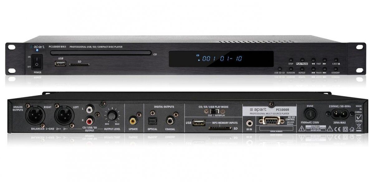 APart PC1000RMKII - комбинированный источник аудио сигнала, совмещающий в себе CD / MP3 / USB / SD проигрыватель. Проигрыватель имеет балансный и небалансный аналоговые выходы, коаксиальный и оптический цифровые выходы и порт RS232 для использования в автоматизированный системах. APart PC1000R позволяет проигрывать файлы MP3 записанные как на CD, так и на DVD диски.