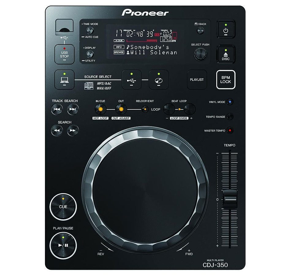 Профессиональный CD-проигрыватель с фронтальной загрузкой и набором всех необходимых функций, среди которых полнофункциональное проигрывание записей в формате MP3, AAC, WAV и AIFF. CDJ-350 способна работать с CD Audio и MP3 файлами, записанными на CD, а благодаря порту USB вы получаете возможность использовать фонотеки, хранящиеся на внешних накопителях в формате MP3, AAC, WAV и AIFF. Применение программного обеспечения rekordbox™ позволит обеспечить CDJ-350 анализатором BPM, а так же создавать библиотеки и сортировать их по жанрам.