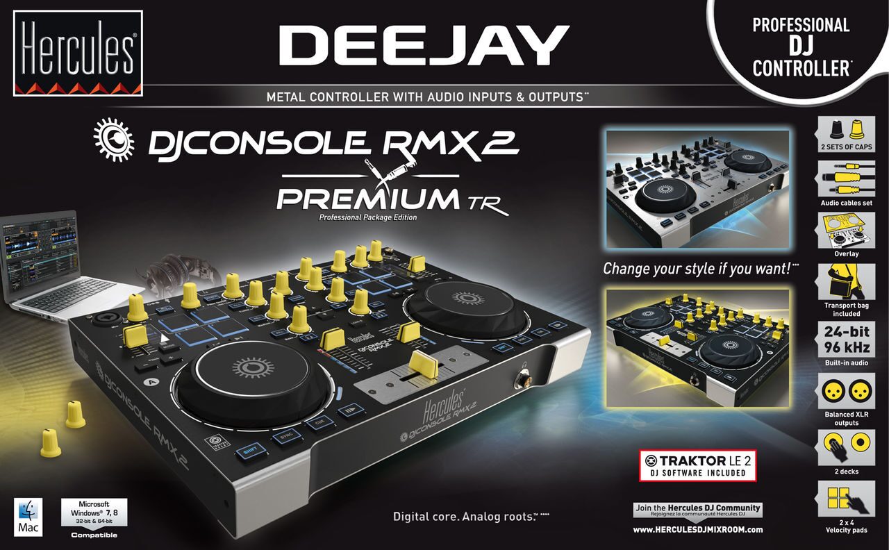 Hercules DJ Console RMX 2 TR – недорогой современный двухканальный DJ-контроллер начального уровня. Его отличают компактные размеры, малый вес, отличный функционал и высокое качество исполнения. Данное решение адресовано начинающим ди-джеям, работающим дома в обстановке ограниченного пространства, а также мобильным ди-джеям, выступающих в клубах и на частных вечеринках, участвующих в рекламных шоу и торжественных мероприятиях.