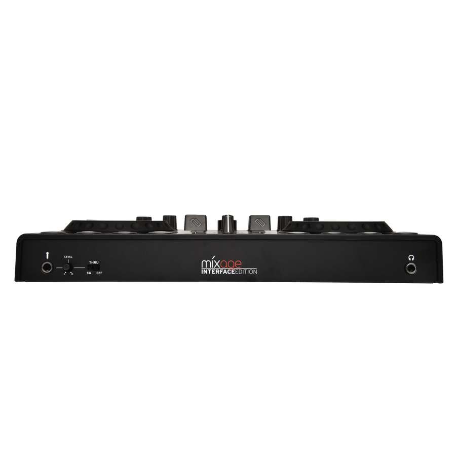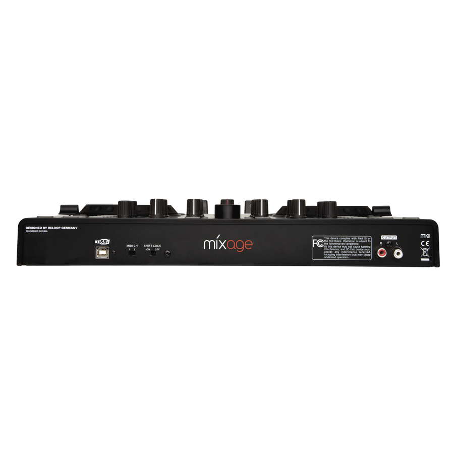 Помимо классически расположенного 2-х канального 3-х полосного эквалайзера и регулятора чувствительности, на контроллере дополнительно расположены светодиодные индикаторы уровня громкости и индикаторы сигналов MIDI и питания. Большой и удобный энкодер Trax позволяет с легкостью находить нужные треки в вашей коллекции. Так же под рукой находятся и регуляторы уровня Мастера и наушников, а так же удобный мини-фейдер CUE-mix. Для удобства, на задней панели расположены регуляторы чувствительности джогов и яркости подсветки. Переключатель shift-lock позволяет переключаться между режимами постоянно включенной и удерживаемой кнопки shift. И, наконец, DJ Team переключатель: два Mixage контроллера могут быть подключены к одному компьютеру. Таким образом одна команда диджеев может контролировать четыре деки в одной программе (необходим Traktor Pro)
