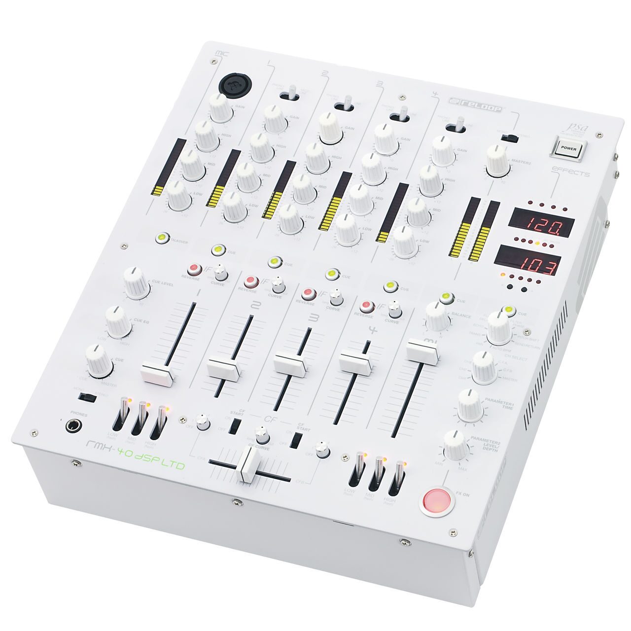 Reloop RMX-40 DSP LTD имеет 4 канала. Все каналы обрудованы 2-мя режимами работы PHONO или LINE. Каждый канал имеет трехполосный эквалайзер и регулировку чувствительности. Эквалайзер вырезает частоту полностью (-40Дб/+10Дб), минимально затрагивая соседние полосы. Фейдера длинной 60 мм имеют настройку кривой атаки фейдера и реверс. Кроссфейдер также с настраиваемой кривой и реверсом.Все фейдера и кроссфейдер с длительным жизненным циклом.