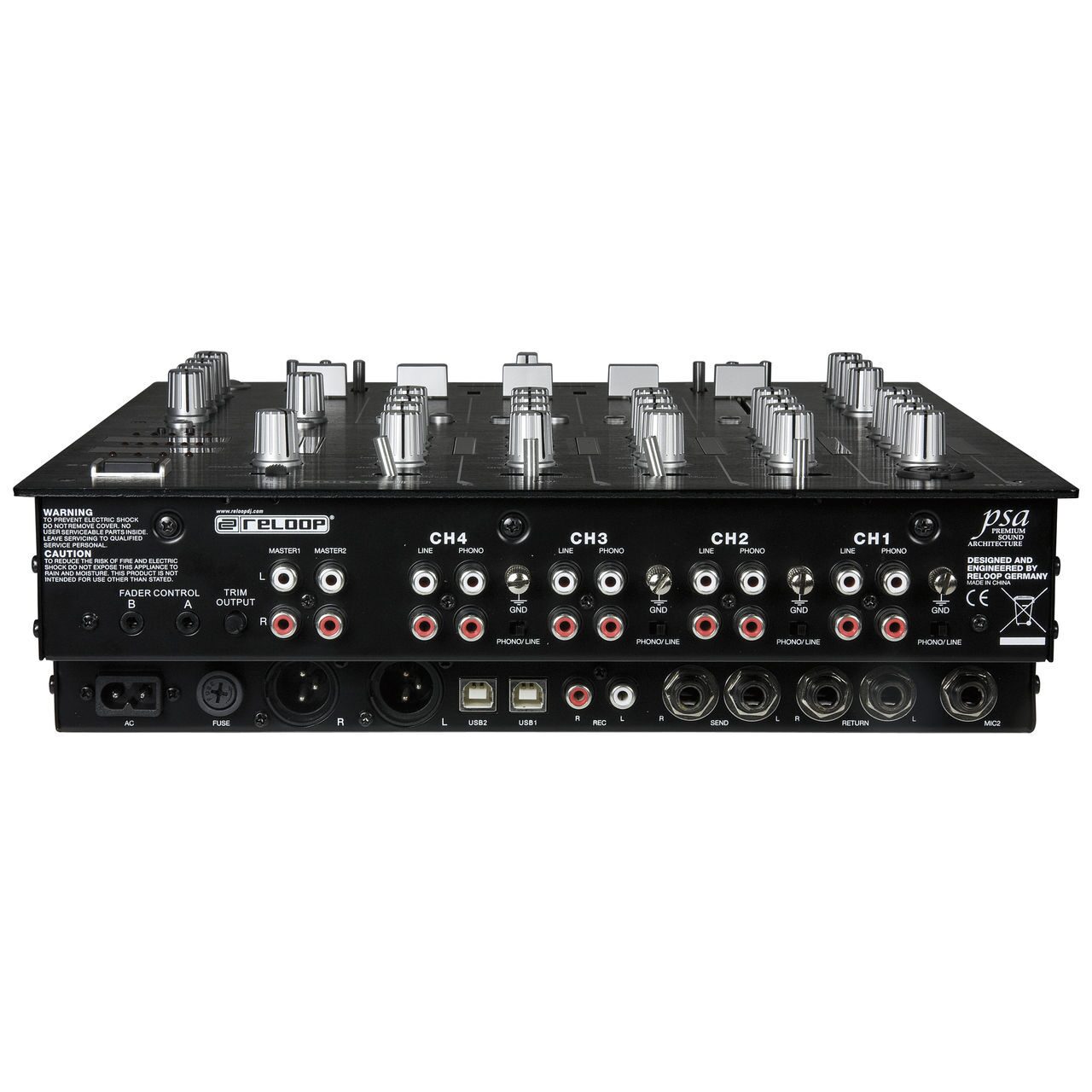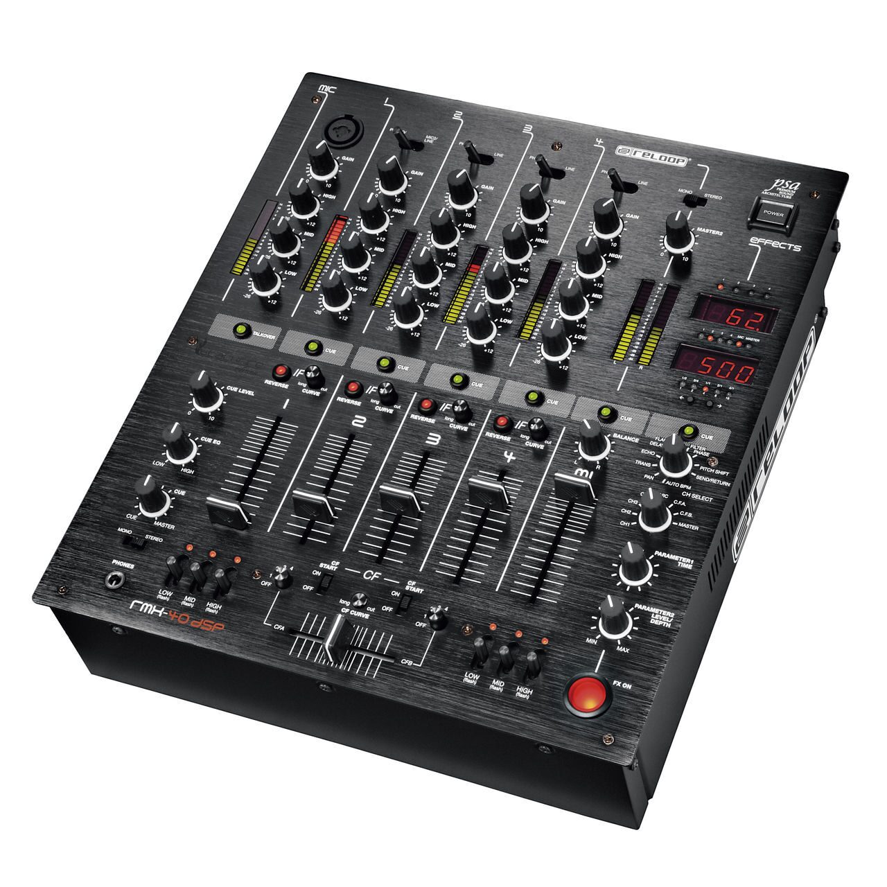 Reloop RMX-40 USB имеет 4 канала. В пульт встроена звуковая карта, имеется USB терминал, который дает возможность подключения пульта к ПК. Все каналы обрудованы 2-мя режимами работы PHONO или LINE. Каждый канал имеет трехполосный эквалайзер и регулировку чувствительности. Эквалайзер вырезает частоту полностью (-40Дб/+10Дб), минимально затрагивая соседние полосы. Фейдера длинной 60 мм имеют настройку кривой атаки фейдера и реверс. Кроссфейдер также с настраиваемой кривой и реверсом.Все фейдера и кроссфейдер с длительным жизненным циклом.
