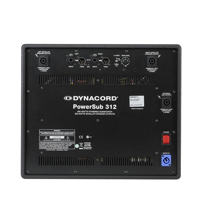 C помощью переключателя „X-Over“ можно выбрать три независимых частоты кроссовера для сабвуфера и сателлитов: 70 Гц, 100 Гц и 140 Гц, а регулятор „Sub Level“ позволяет устанавливать диапазон выходного сигнала от -8 дБ до 10 дБ. Встроенный цифровой усилитель, обеспечивающий 800 Вт + 2 х 250 Вт, разработан специально для НЧ-динамика DYNACORD DND 12S400 для расширения динамического диапазона и качества аудио-сигнала, а также обеспечения оптимального режима работы динамика. для обеспечение максимальной надежности работы сабвуфера установлена дополнительная система защиты: защита голосовой катушки, аудиолимитеры, защита от повреждения постоянным током, защита от повреждения ВЧ, противо-ЭДС и термозащита. Применение цифровых технологий класса D обеспечивает меньшее рассеивание мощности, чем у обычных усилителей класса АВ.