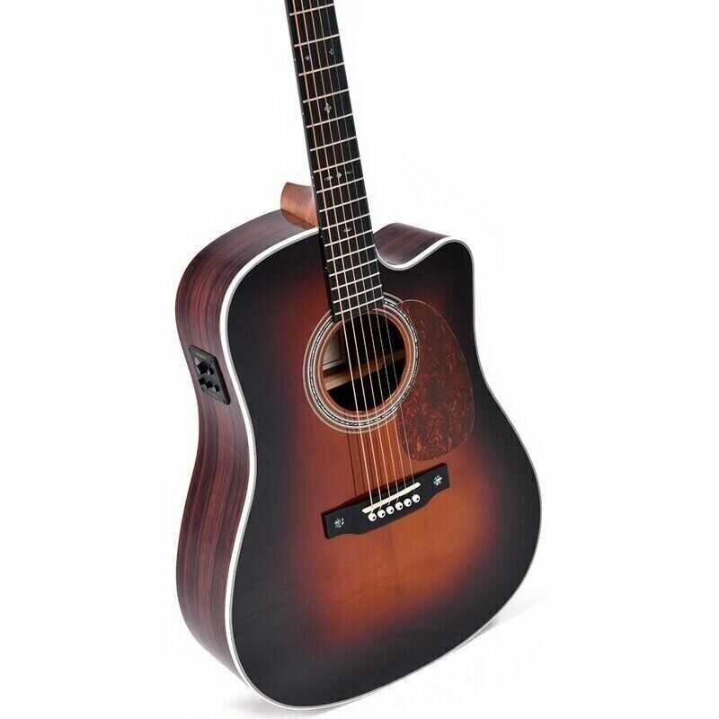 Sigma DTC-1E-SB – интересная электроакустическая гитара во всех отношениях, сочетающая в себе очаровательную эстетику с современным дизайном и удобством игры, без завышенной цены. Корпус у нее сделан из тилии (липы), которая известна своими яркими акцентами на средних частотах с отличным сустейном. А верхняя дека – из массива сихтинской ели, древесина, которая часто используется на гитарах, которые стоят значительно дороже, чем эта! Добавьте к этому удобный гриф из махагони и необычную накладку из микарты, и в вашем распоряжении великолепный коктейль резонансных тонов. Изгибы дредноут корпуса были тщательно продуманы, чтобы обеспечить комфортную игру. Электроника Fishman Presys II идеально передает первозданные гармонические детали акустического голоса и предлагает элементы управления тональной настройки и тюнер.