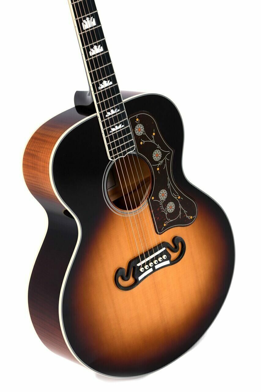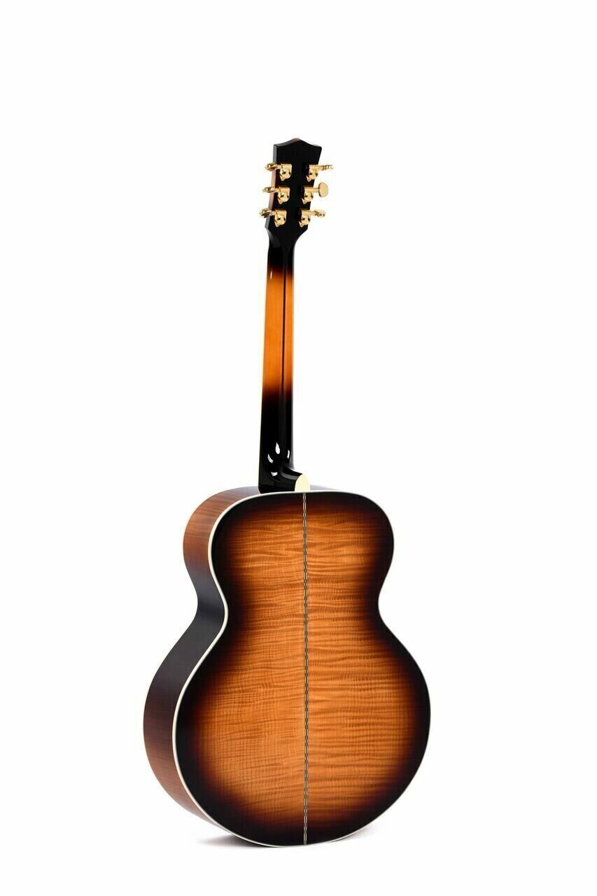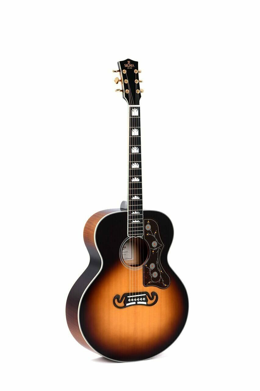 Sigma GJA-SG200 - электроакустическая гитара формы Джамбо, которая предоставляет теплое звучание басов, благодаря большому глубокому корпусу. Она будет отличным выбором для тех гитаристов, кто предпочитает стиль fingerstyle, поскольку ее ''тонкая талия'' позволяет держать инструмент ближе к телу, а также тем, кому необходим насыщенный объемный звук. Сочетание сихтинской ели и волнистого клена обеспечивает идеальным балансом резонансного тона с универсальностью. Ель очень популярная древесина в производстве акустических гитар, так как она дает сильную проекцию, широкий динамический диапазон и приспосабливается к различным стилям исполнения, а в комбинации с кленом можно ожидать превосходную теплоту, насыщенность и сустейн. Если нужна дополнительная громкость, можно воспользоваться встроенной электроникой Fishman Sonitone, которая характеризуется установленным в резонаторное отверстие преампом. Простая в использовании система также оборудована поворотными регуляторами громкости /тона и безупречна для больших событий, где в естественный акустический голос необходимо добавить проекции.
