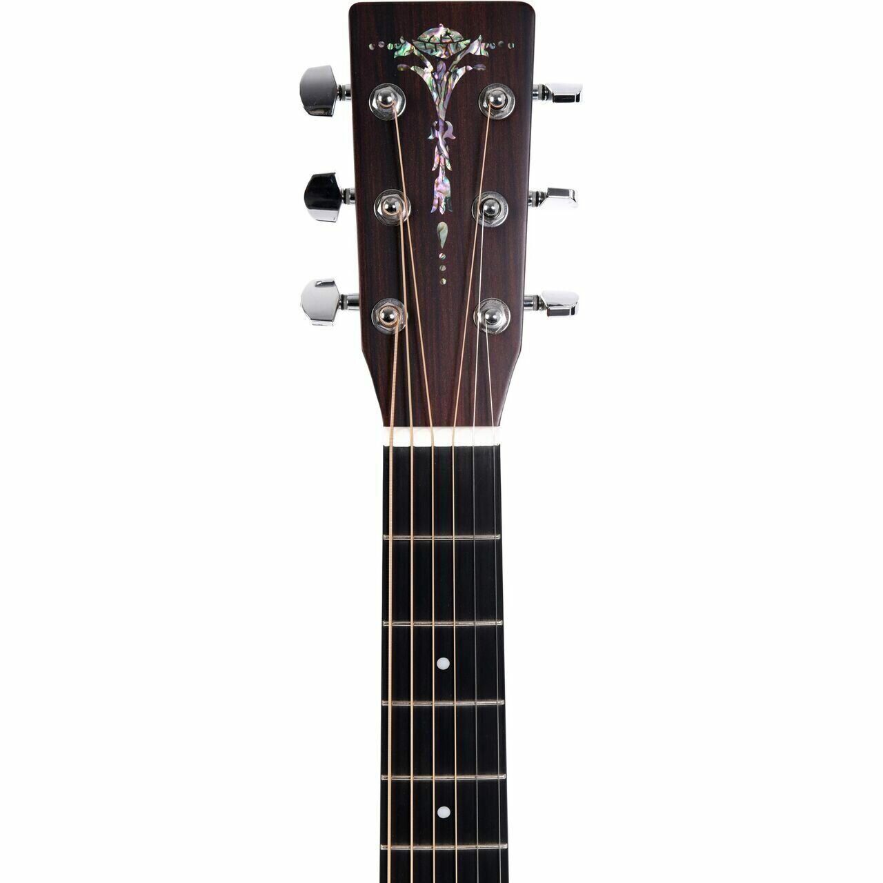 Возможность подключения к акустической системе, микшерному пульту или аудиоинтерфейсу обеспечивает активный пьезозвукосниматель Sigma. Помимо возможности усиления сигнала он предлагает хроматический тюнер с ЖК-дисплеем и 3-полосный эквалайзер. С помощью последнего можно гибко скорректировать тембр в зависимости от типа АС, помещения для записи и других факторов. За стабильный и точный строй отвечают литые хромированные колки, а для защиты поверхности от удара ногтями или медиатором предусмотрен черный пластиковый пикгард. С завода на гитару установлен комплект струн D'Addario EXP16.