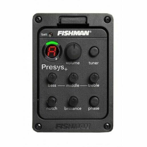 Активный звукосниматель Fishman Presys+ со встроенным тюнером оснащен регуляторами низких, средних и высоких частот, позволяя настроить идеальное звучание. Также в нем есть кнопка фазы с обратной связью, ручки управления громкостью, яркостью и notch.
