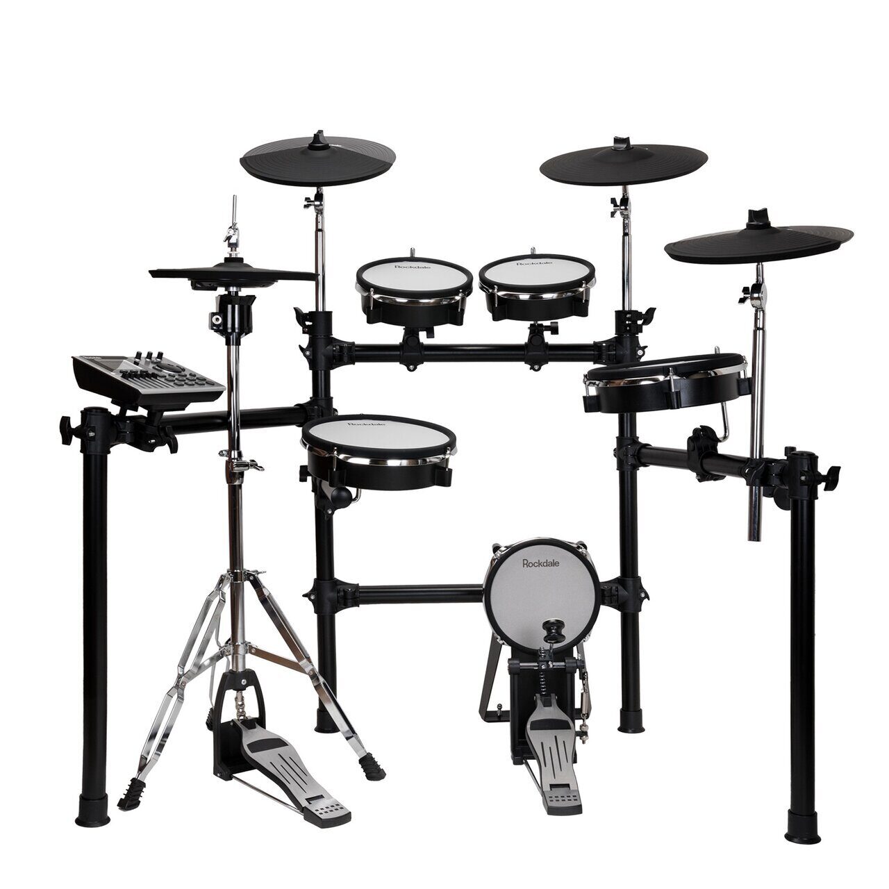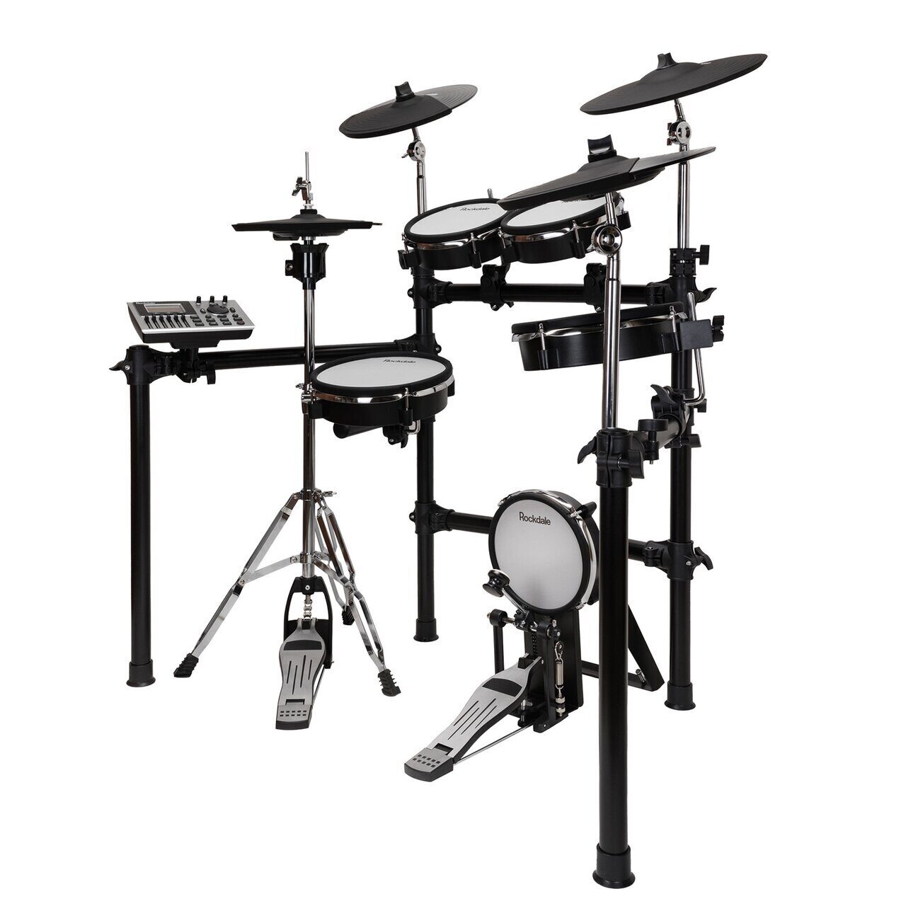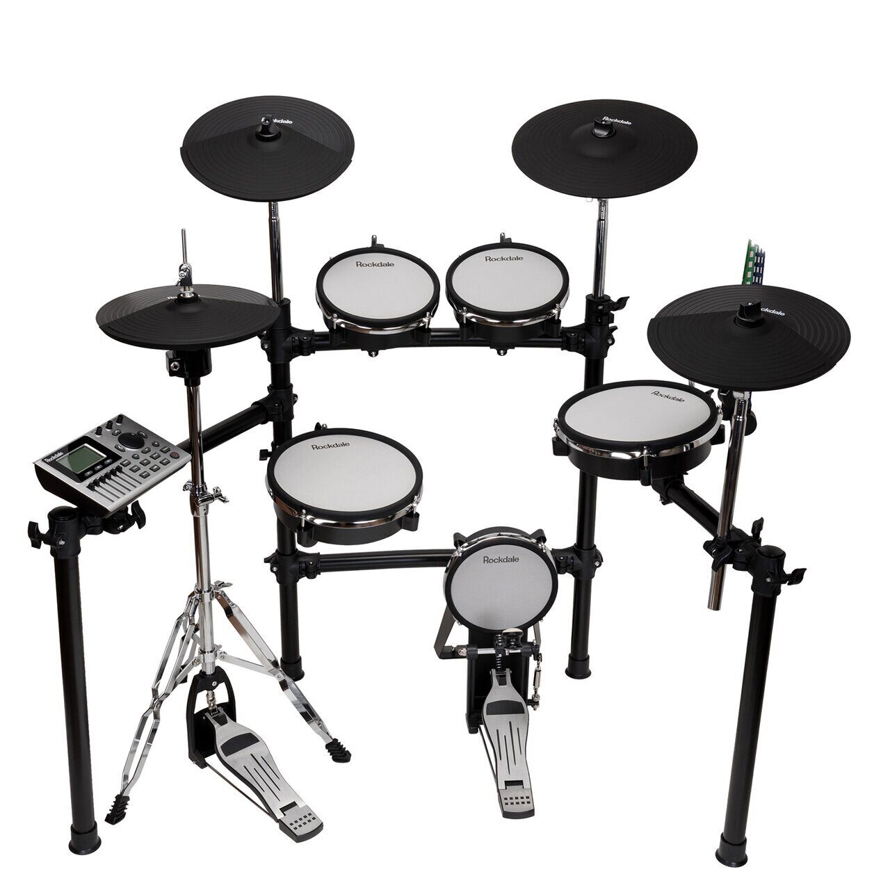 Rockdale SD201-3SH имеет 10-дюймовый двухзонный сетчатый малый барабан, два 8-дюймовых двухзонных сетчатых тома и 10-дюймовый двухзонный сетчатый «флор» том, расположение и угол наклона которых может варьироваться исходя из предпочтений барабанщика. А также имеется 8-дюймовый сетчатый пэд бас-барабана.