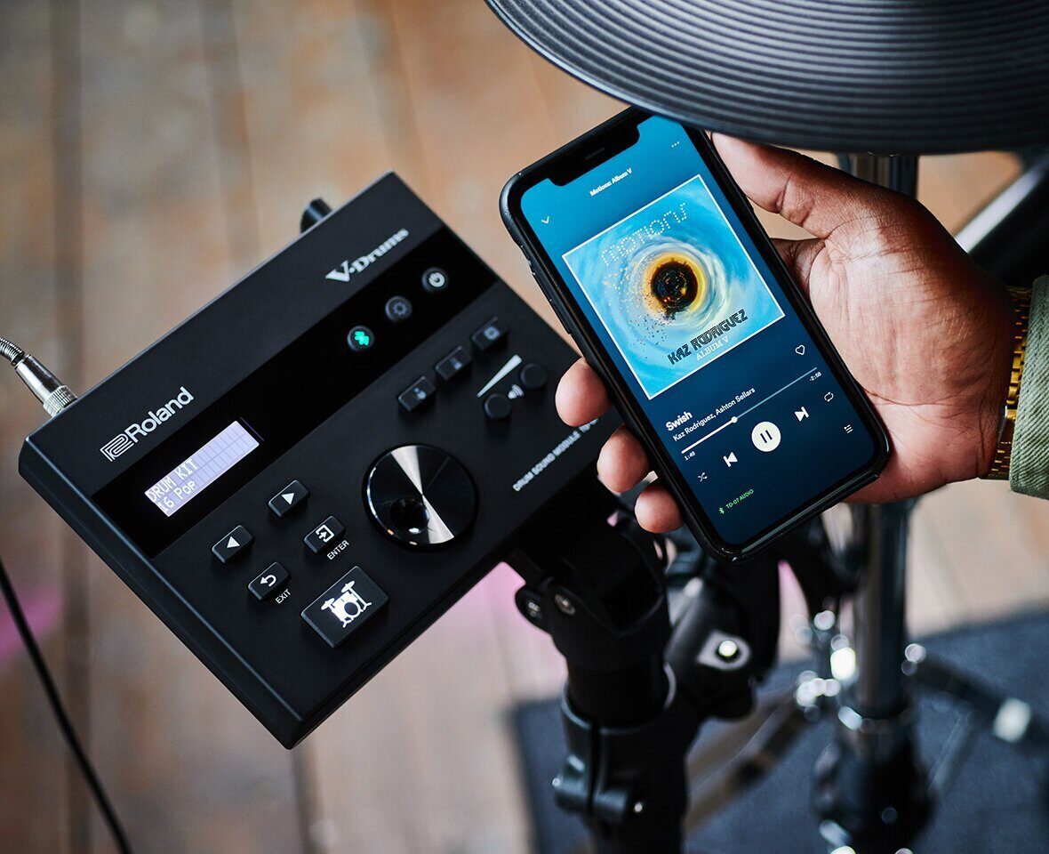 Технология Bluetooth, реализованная в TD-07KVX, позволяет превратить практические занятия в интерактивные. Чтобы играть вместе с вашими любимыми композициями или коллективами, просто выберите нужный файл на смартфоне, планшете или компьютере, а затем запустите потоковую передачу аудио по беспроводной связи через звуковой модуль и процесс пошел. Кроме проигрывания в режиме онлайн пьес и уроков, можно передавать также и видео. Поддерживается также передача MIDI-информации по Bluetooth для беспроводной записи MIDI-данных в музыкальные программные приложения. А если устройства Bluetooth под рукой не оказалось, не расстраивайтесь, а просто подключитесь с помощью стереокабеля и играйте.