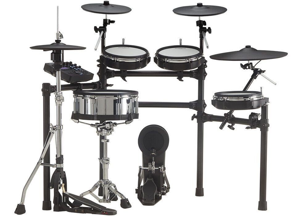 Многие из электронных установок ударных не позволяют добиться ощущения игры на акустических ударных главным образом в силу того, что используемые в первых пэды слишком маленькие и легкие. Установка ударных TD-27KV решает эту проблему за счет комплектации пэдами барабанов и тарелок большого диаметра, которые располагаются в пространстве точно так же, как и в акустической установке. В результате барабанщик будет чувствовать себя "как дома". Малый барабан 14” x 4.3” из нержавеющей стали и томы 10" с легендарными многослойными сетчатыми мембранами компании Roland отличаются превосходным откликом и предусматривают возможность регулировки натяжения для обеспечения естественного отскока. Тарелки хай-хэта 12" устанавливаются на стандартную стойку акустического хай-хэта, а тарелка райд 18" и тарелки крэш 12" и !3" — на прочные штанги для естественных ощущений при работе палочками и раскачивания.