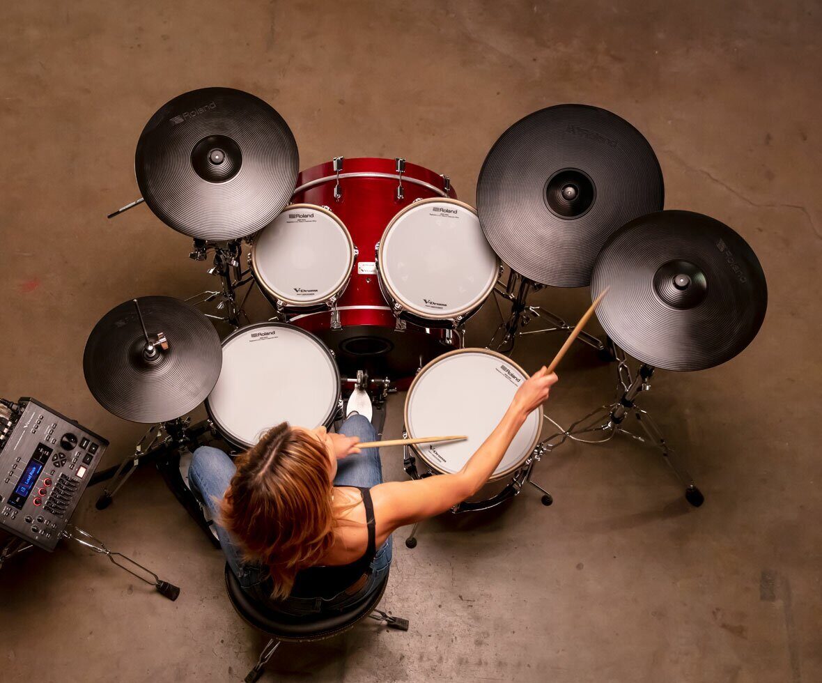 Барабаны установки ударных VAD706 оборудованы знаменитыми многослойными сетчатыми мембранами компании Roland. На малый барабан и напольный том натянуты трехслойные мембраны, а на крепящиеся на раму томы двухслойные. Эти мембраны обеспечивают естественные сопротивление и отскок, которые можно отрегулировать согласно вашему стилю игры. Установка колотушки в специально разработанный бас-барабан позволило получить превосходный результат, поскольку при этом создается сопротивление воздуха, как при игре на акустическом бас-барабане. Получаемые от игры органичные ощущения распространились и на томы, корпуса которых выполнены из дерева и оборудованы традиционными креплениями, все как у натуральных акустических томов.