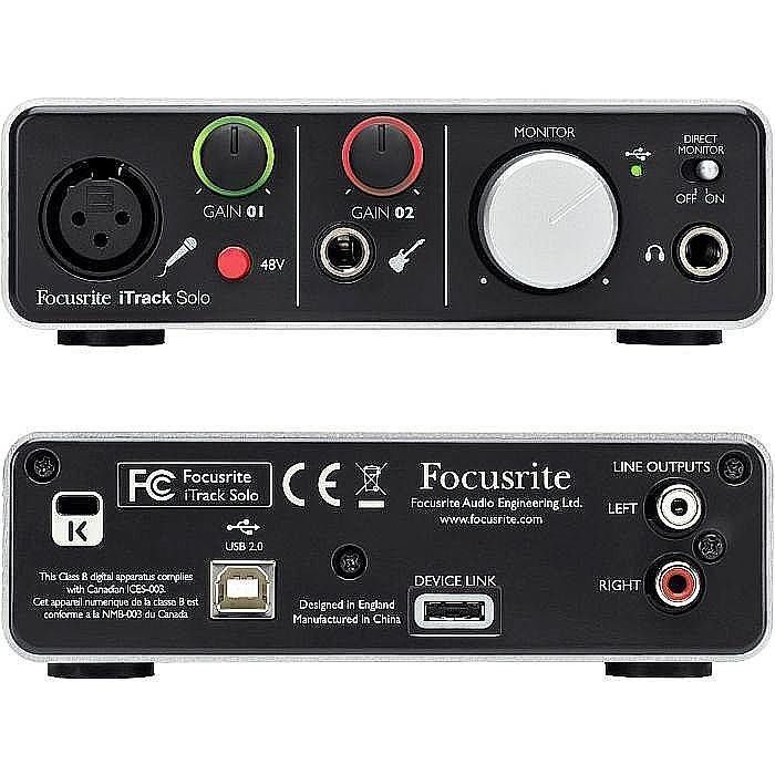 Основа iTrack Studio – это аудиоинтерфейс iTrack Solo, который может производить запись аудио с разрядностью до 24 бит и частотой до 96 кГц. Он заключен в компактный, но очень прочный металлический корпус, оснащен высококачественным микрофонным предусилителем собственного производства Focusrite. На передней панели устройства размещены разъемы: микрофонный вход XLR, инструментальный вход 1/4 джек, а также выход на наушники 1/4 TRS. Также на передней панели расположены два регулятора Gain со светодиодными индикаторами сигнала вокруг них, общий регулятор уровня выходного сигнала (линейный выход и выход на наушники) и зеленый светодиодный индикатор наличия USB подключения. На задней панели имеется порт device link для подключения iPad и порт USB для соединения с компьютером, два небалансных выхода RCA и разъем Kensington Lock.