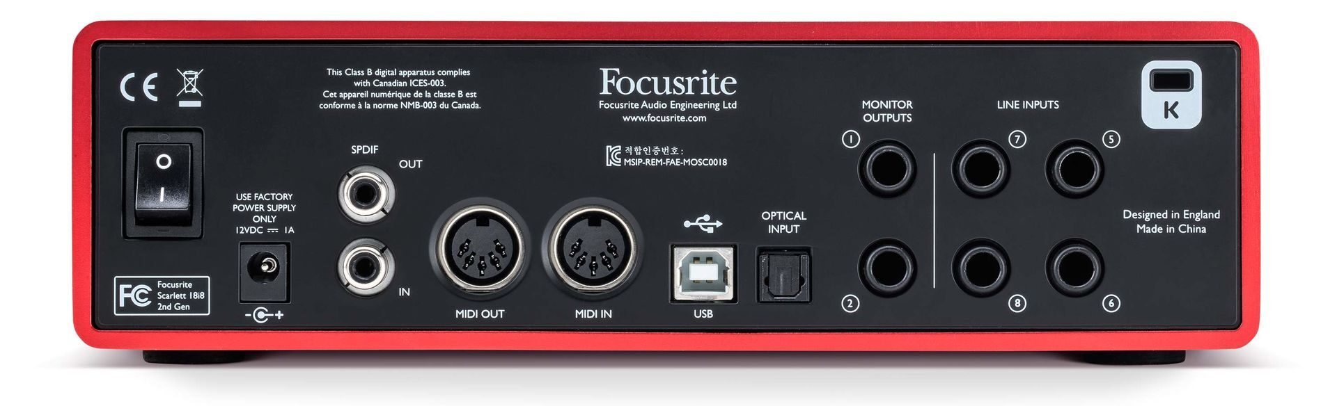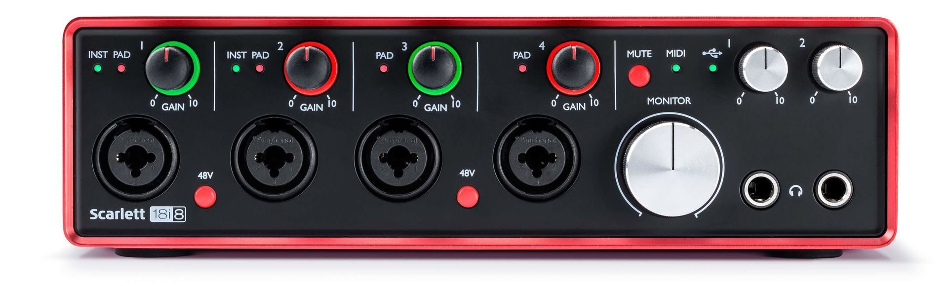 Focusrite Scarlett 18i8 идеально подходит для музыкантов, звукорежиссеров, продюсеров и небольших групп которые хотят записывать полный спектр музыкальных инструментов, таких как барабаны, гитара, вокал, клавиши и т.д. одновременно. Четыре комбинированных входа с микрофонными предусилителями Scarlett с супер-низкой задержкой дополнены четырьмя линейными входами, цифровыми i/o каналами, двумя мониторными выходами, а так же двумя выходами для наушников. Вход ADAT позволяет расширить сессию записи до восьми микрофонных линии. Focusrite Scarlett 18i8 поставляется с эксклюзивной версией Pro Tools | First и Ableton Live Lite и совместимы со всеми версиями MAC и PC.