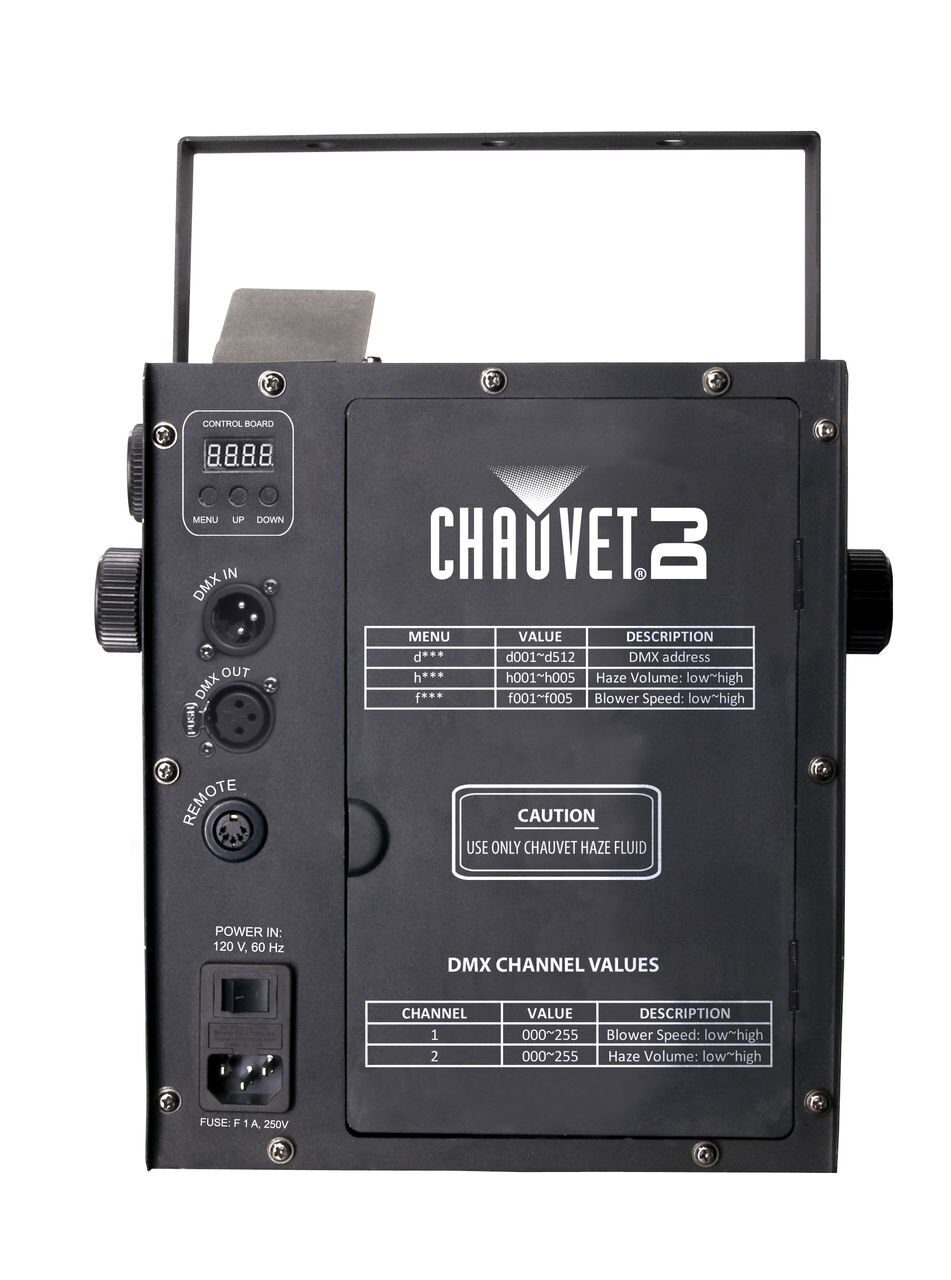 CHAUVETHurricaneHaze 2D — это генератор тумана, который работает на жидкостях в которых есть водная основа. Аппарат обладает очень высокой производительностью — 34 кубических метра в минуту, при этом расход необходимой для тумана жидкости составляет всего 21 миллилитр в минуту. Время нагрева аппарата до рабочей готовности составляет пять минут. Еще одна особенность, которая качественно отличает данный генератор среди аналогичных устройств в том же ценовом диапазоне, это наличие дисплея, встроенный адаптер DMX, регулируемая заслонка направления струи.