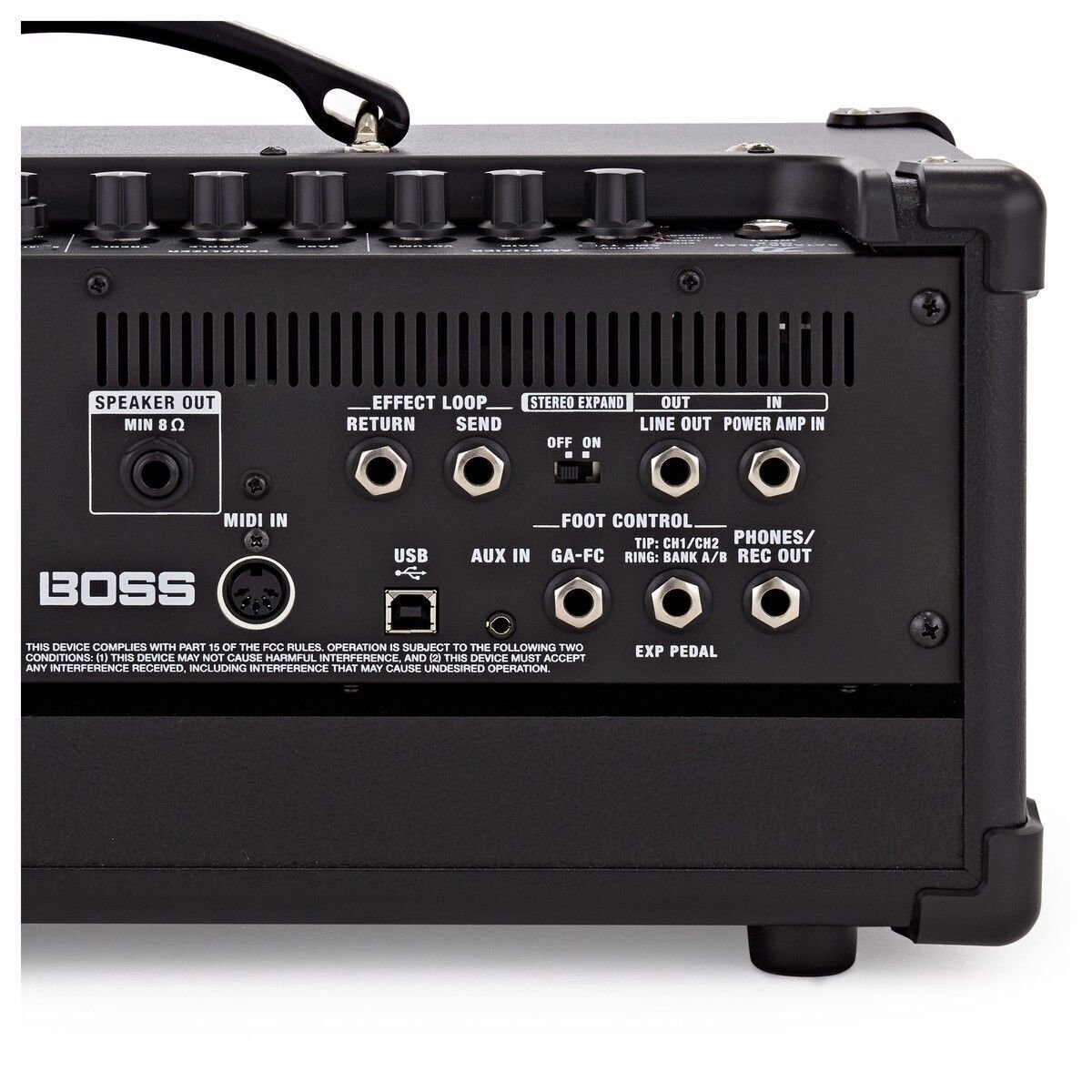 Удобно управлять всеми функциями можно с помощью опциональных футсвичей, педалей экспрессии и контроллера ROLAND GA-FC, для которых есть два входа на разъемах 1/4'' Jack TRS. Таким же разъемом представлен и выход для наушников, оборудованный эмуляцией кабинета, а также позволяющий вывести аудиосигнал для записи в рекордер или аудиоинтерфейс. Для подключения мобильных устройств или плееров имеется вход AUX на разъеме 1/8'' Jack TRS. На стандартных разъемах 1/4'' Jack TS сделана последовательная/параллельная петля эффектов, а также присутствует MIDI-вход, предназначенный для коммутации с MIDI-контроллером, способного переключать пресеты.