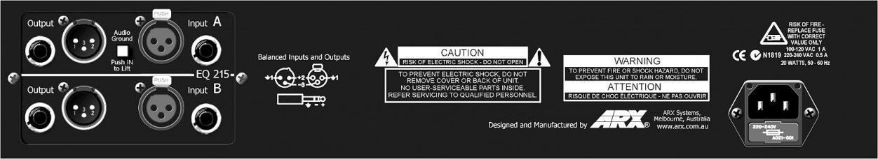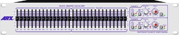 Графический эквалайзер EQ 215 имеет два канала. На каждом канале есть 15 фильтров (две третьих октавы) со слайдерами длиной 60 мм, регулятор выходного уровня, светодиодный индикатор перегрузки, регулятор частоты среза, кнопка и светодиодный индикатор включения встроенного фильтра высоких частот, кнопка и светодиодный индикатор активизации канала (холодный обход), переключатель и светодиодный индикатор максимальной глубины эквализации (+/-6 или +/-15 дБ), симметричные входы и выходы (XLR и джеки, продублированы), переключатель заземления.