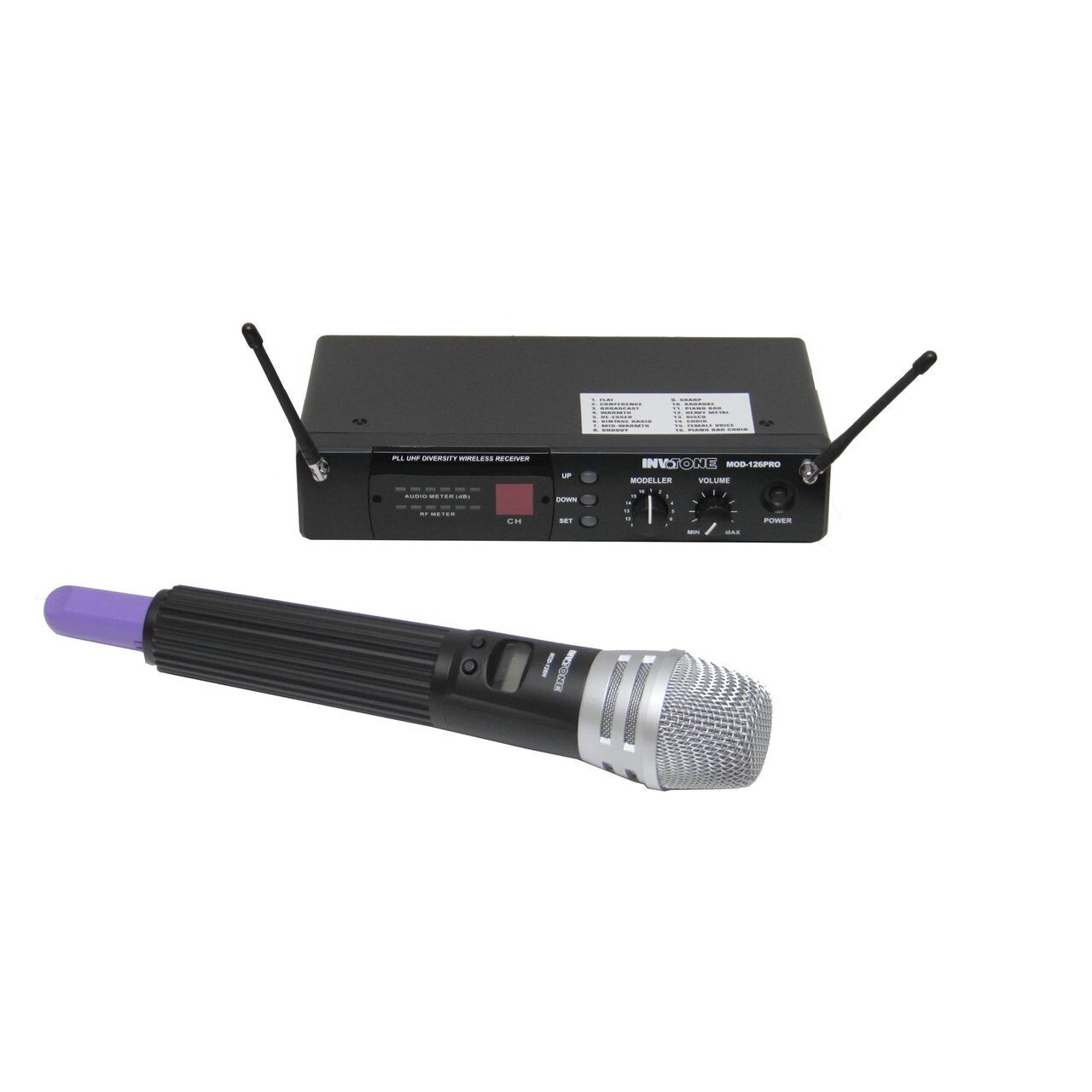 INVOTONE MOD-126 беспроводная система была разработана для вокалистов, ведущих и выступающих музыкантов. Эти беспроводные системы основаны на сложной и инновационной схеме PLL, которые, в то же время, просты в использовании. Большие дисплеи с задней подсветкой доступны и в приемнике и в передатчике, простые меню допускают большое количество функций, таких как выбор частоты, чувствительность, приглушение, и т.д. Но что делает беспроводные системы MOD126 действительно уникальными - это схемы моделирования. Специальные модели были созданы для человеческого голоса,