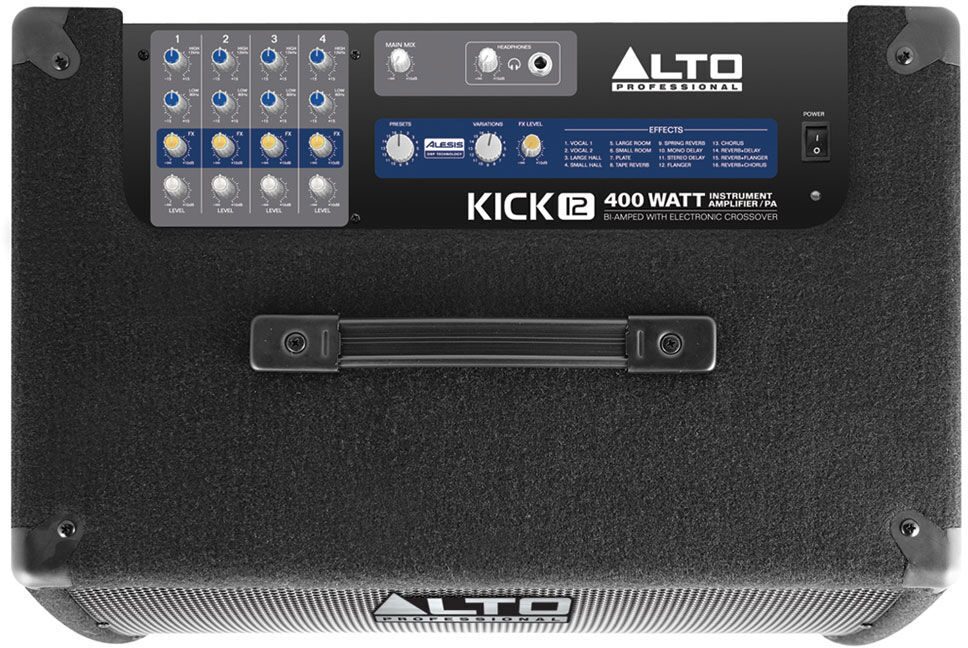 Alto KICK 12 является мощным усилителем, который подойдёт как для барабанщиков, так и для клавишников. При разработке усилителя большое внимание уделялось каждой детали, и модель не уступает ведущим бас усилителям. Имея у себя этот усилитель, Вы получаете точно настроенный кроссовер, 400 Вт номинальной мощности в двойном усилении, 4-канальный микшер и встроенные Alesis эффекты. Для максимальной эффективности каждый компонент был оптимизирован, в результате чего усилитель имеет точное чёткое звучание. Благодаря наличию 4-канального микшера, входов/выходов и эффектам усилитель используют и как барабанный монитор и как клавишный усилитель и как акустическую систему для маленьких помещений. Он является универсальной моделью со звучанием отличного качества. Каждый из динамиков имеет свой собственный усилитель, что позволяет слышать каждую частоту чётко и чисто, не перемешиваясь друг с другом. 24-битный процессор эффектов добавляет усилителю профессиональные штрихи. Kick12 имеет 16 Alesis эффектов, включая flanger, delay, chorus и reverbs. Каждый из эффектов создаёт по 16 вариаций, что в результате даёт 256 пресетов. Дополнительно для наушников имеется разъём стандартного образца.
