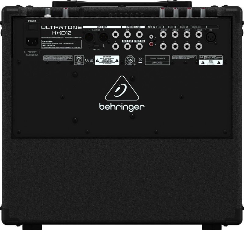 KXD12 оборудован 4 независимыми стерео каналами, каждый с отдельным регулятором громкости и FX посыла, плюс дополнительный XLR микрофонный вход на 1 канале для прямого подключения динамического микрофона. Основная секция комбо предусматривает отдельные регуляторы FX Return, Phones и громкости. Стерео Aux вход позволяет Вам воспроизводить записанную музыку через сам комбо или играть вместе с ней. Также KXD12 имеет отдельный выход для наушников, сбалансированный стерео XLR DI выход с заземлением для прямой записи или подключения дополнительных акустических систем, Link выход, который позволяет подключить второй KXD12, тем самым создав универсальную 1400 Вт портативную акустическую стерео систему. Плюс ко всему этот комбо оборудован 35 мм гнездом для установки на стойку.