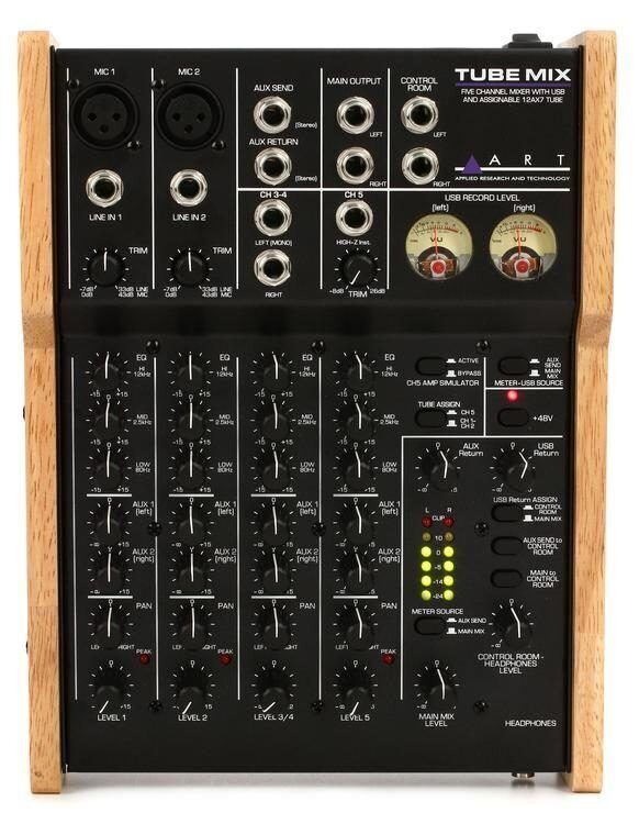 ART Tube Mix – компактный, универсальный аудиоинтерфейс. Микшер предоставляет два микрофонных входов, один инструментальный вход и два линейных входа. Ламповая секция может работать, как двухканальный микрофонный предусилитель или, как двухкаскадный инструментальный предусилитель, добавляя теплоту и окраску сигналу гитары или баса. VU-индикаторы и деревянные боковые панели придают ART Tube Mix стильный винтажный вид.