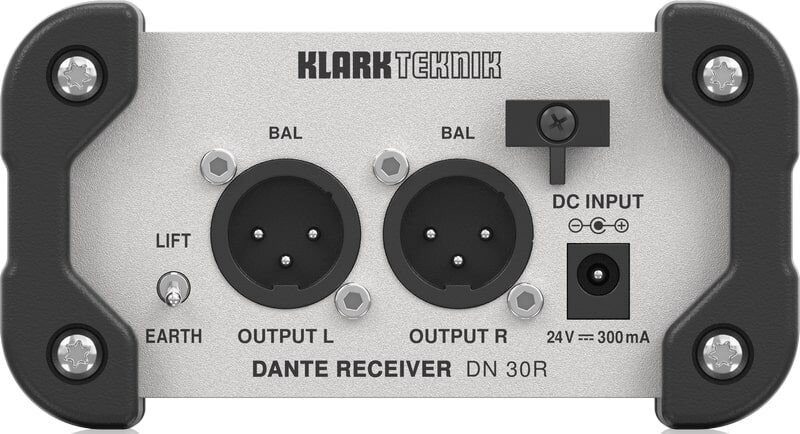 - Двухканальный приёмник сети Dante для подключения к усилителям, активным акустическим системам, микшерам и т.д. по аналоговому соединению.