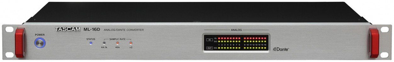 Tascam ML-16D конвертер, ориентированный на работу с протоколом Dante. Устройство предназначенно для вставки или извлечения аналогового аудио в сеть Dante (Digital Audio Network Through Ethernet) или из нее с использованием внешних устройств разлома, которые используют разъемы формата D-Sub. Конвертер имеет 16 аналоговых линейных входов и 16 аналоговых линейных выходов (48 кГц / 96 кГц) с использованием 4 разъемов D-Sub.